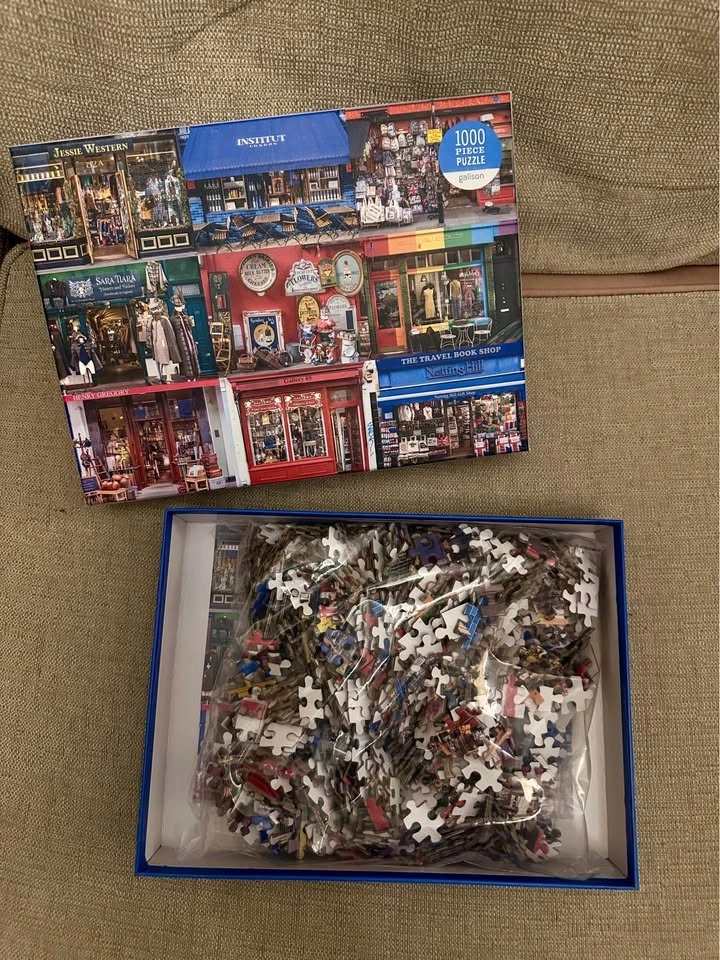 Vibrant Galison jigsaw puzzle with 1000 pieces. Features a colorful scene of Portobello Road London shops. Puzzle size is 27 x 20 inches. Pieces are still sealed in the bag. Never opened. Pickup in Downtown Toronto.