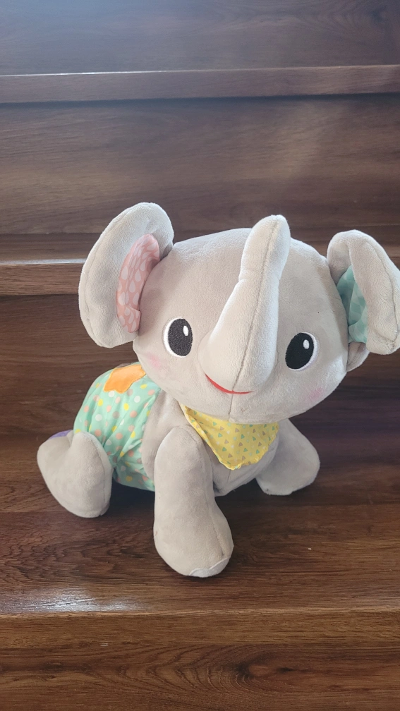 New soft grey elephant plush toy. Features colourful accents and a cute design.It has music feature and encourage baby moves.
