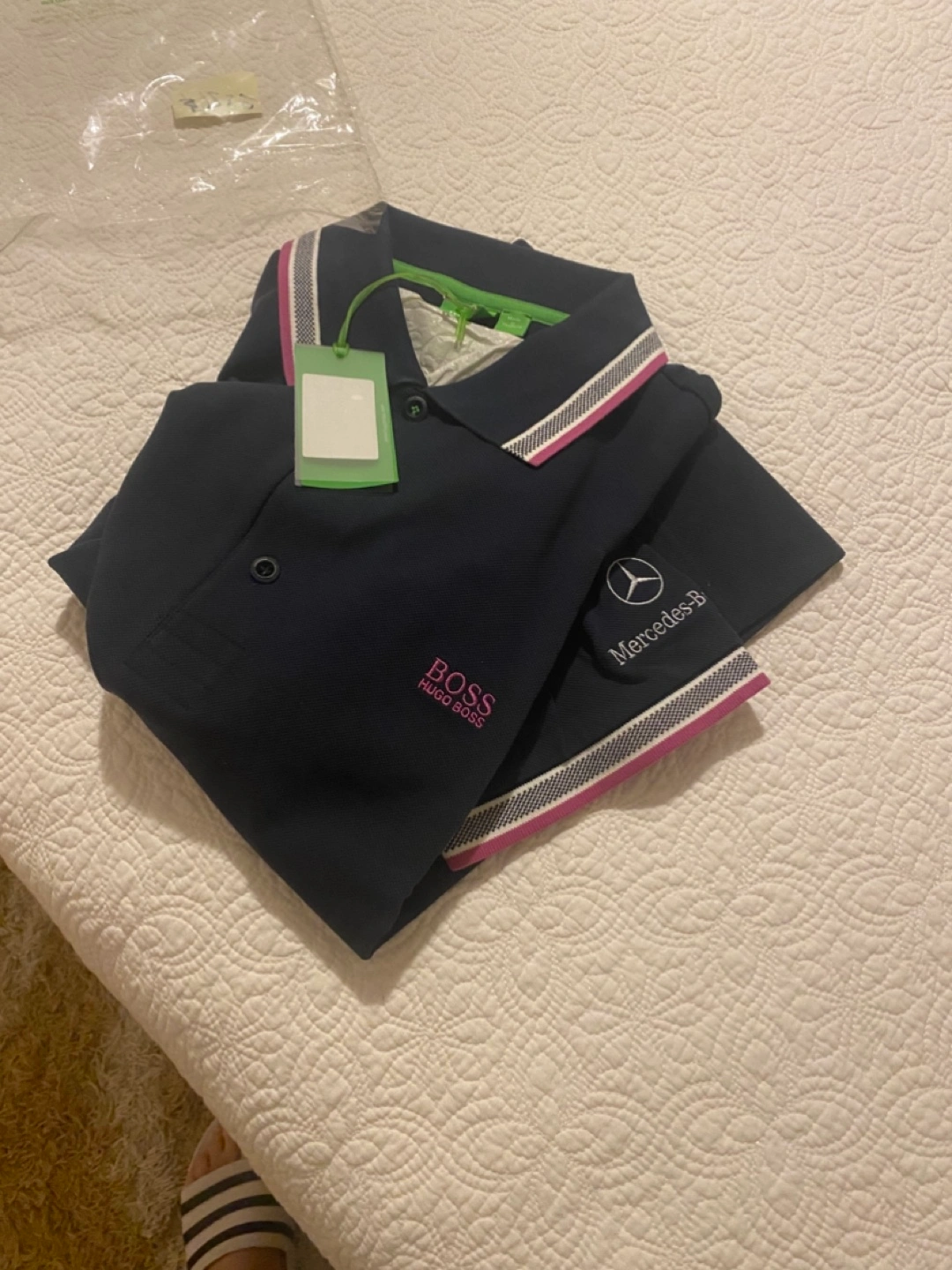 Men's navy blue polo shirt. Features a Hugo Boss logo and Mercedes Benz branding. Lime green inner collar. Pink, white and navy trim.