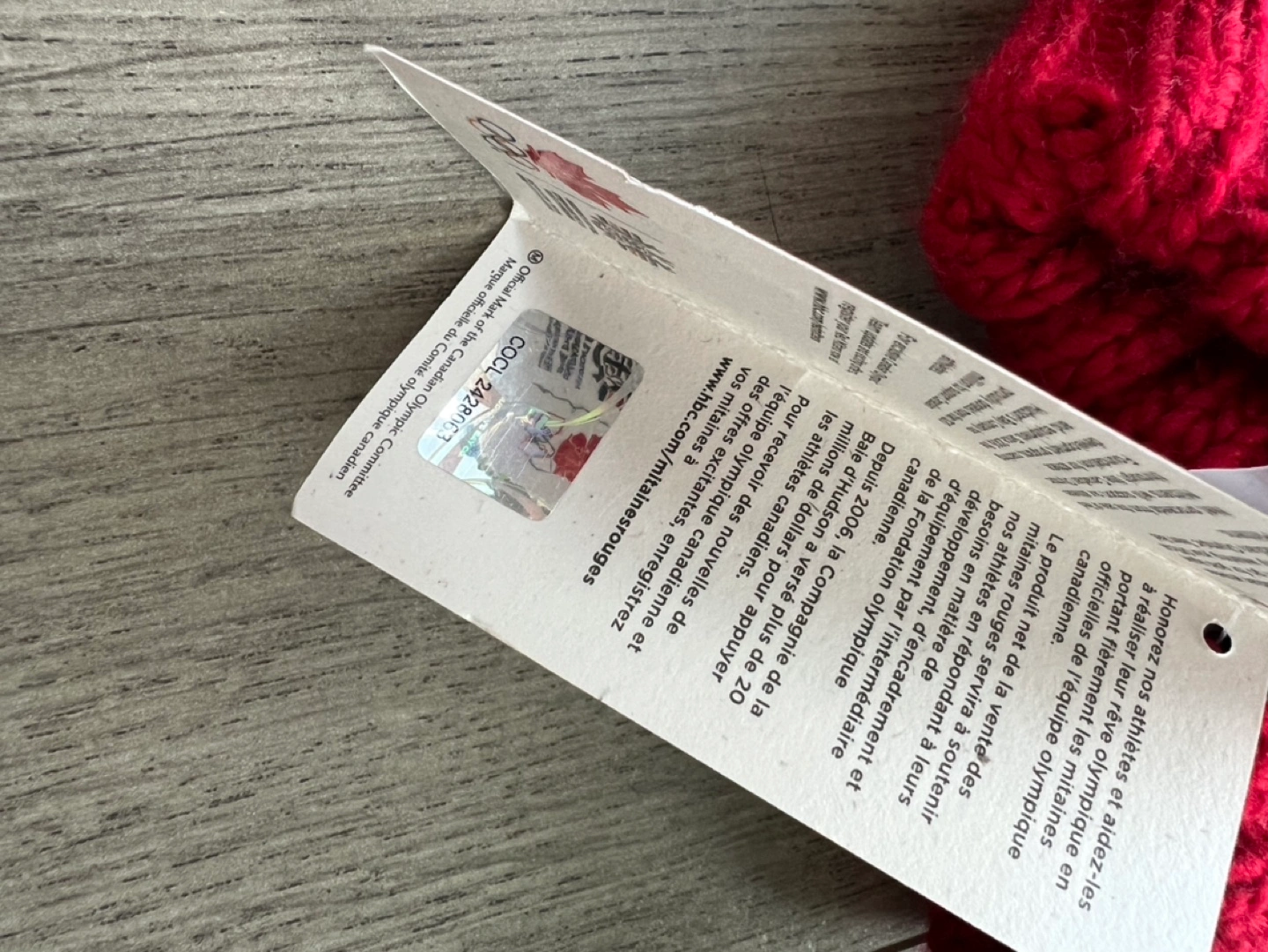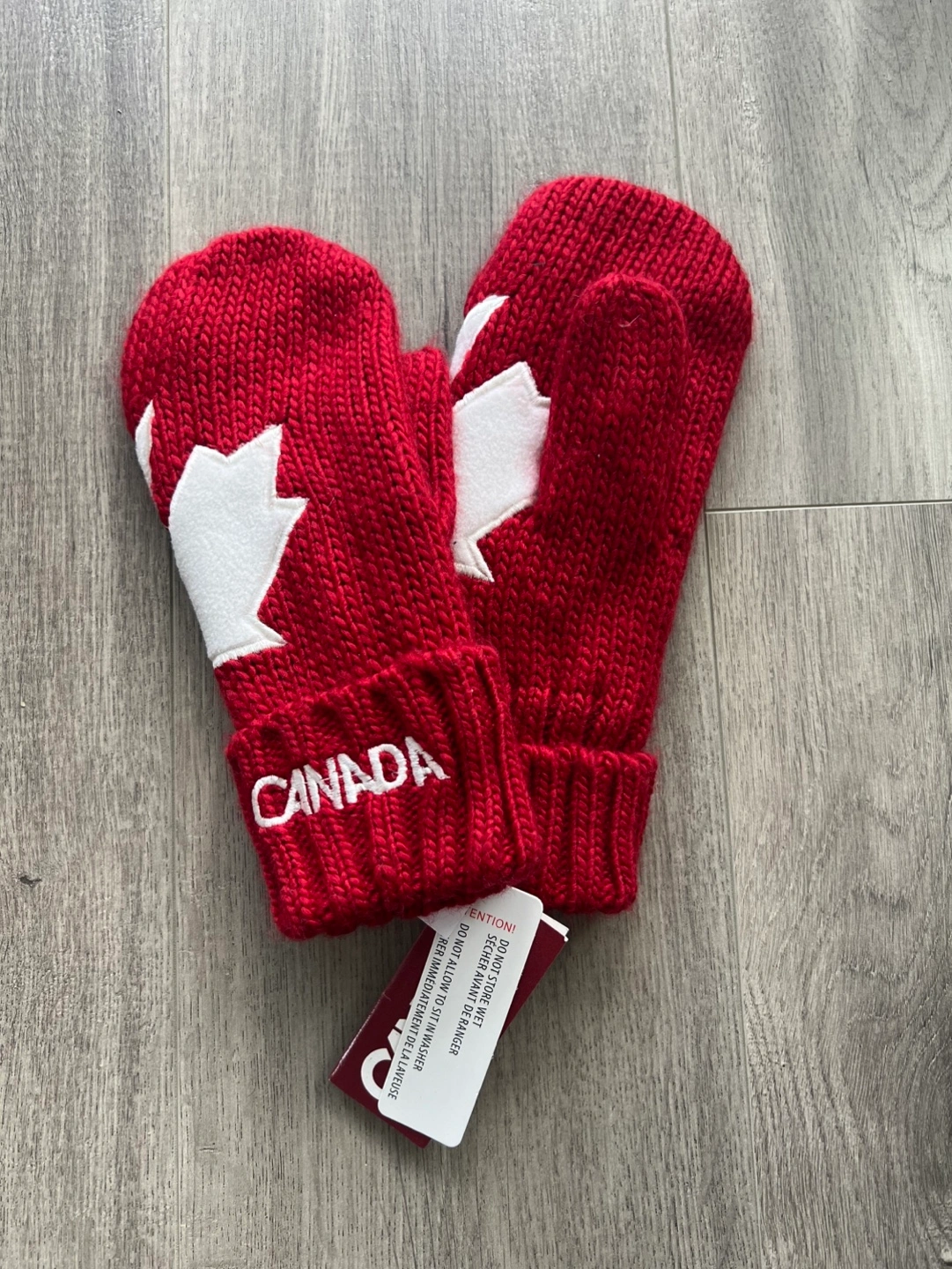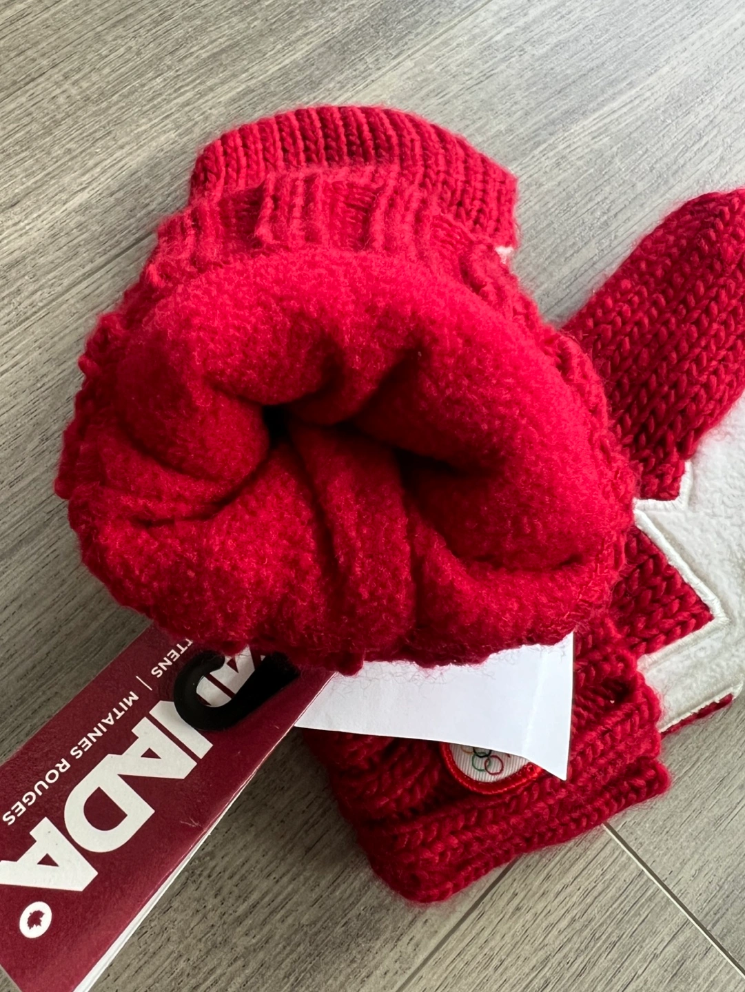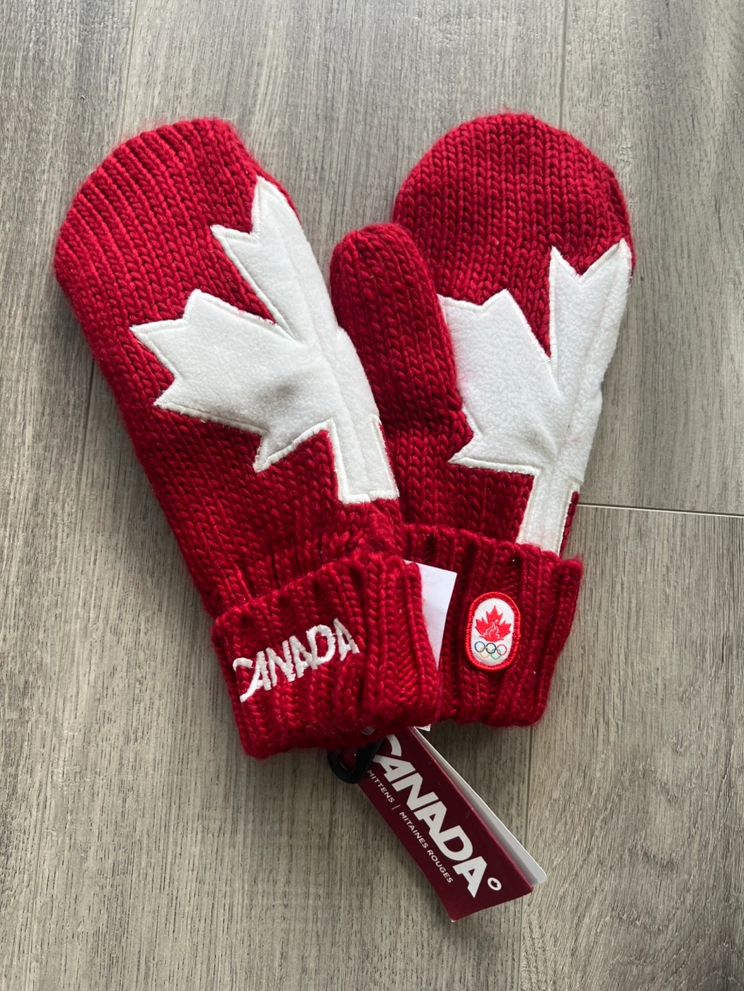 Red knit mittens. Features white maple leaf applique and "Canada" embroidered on cuff. Olympic rings logo on cuff. New with tags.