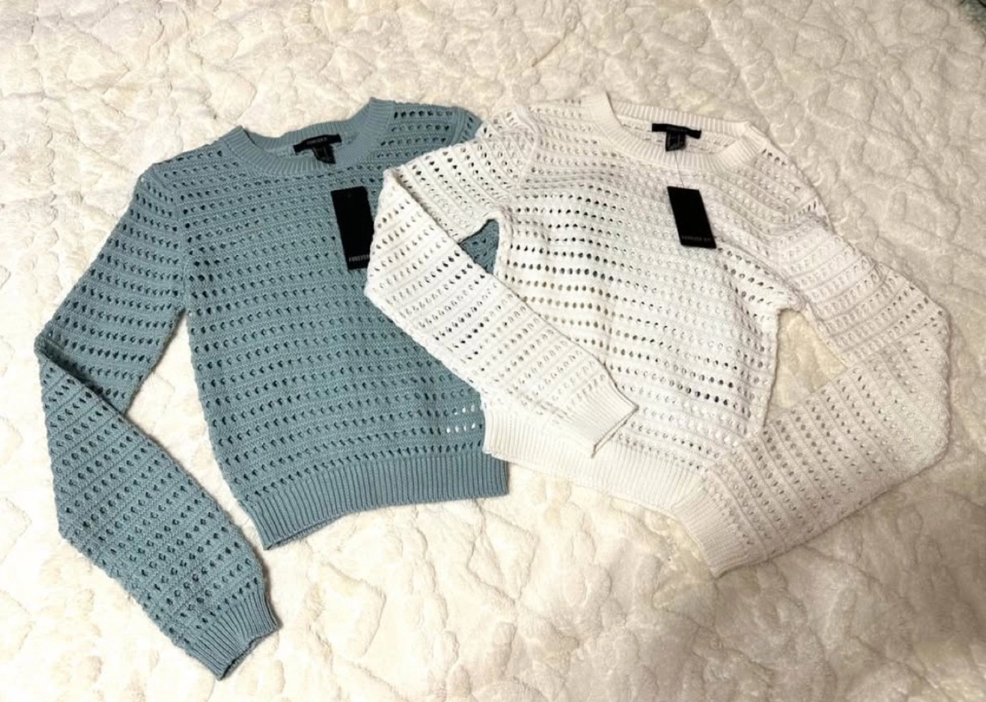 Two new Forever 21 sweaters. Long sleeves. Crochet knit pattern. Crew neck. Lightweight material. Size small.