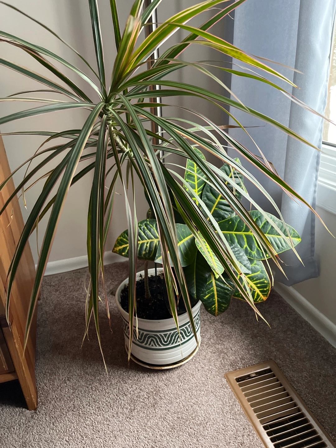 Two beautiful houseplants potted together. Dracaena Marginata with long, slender leaves and a Croton with variegated foliage. Planted in a decorative pot. Healthy and vibrant.