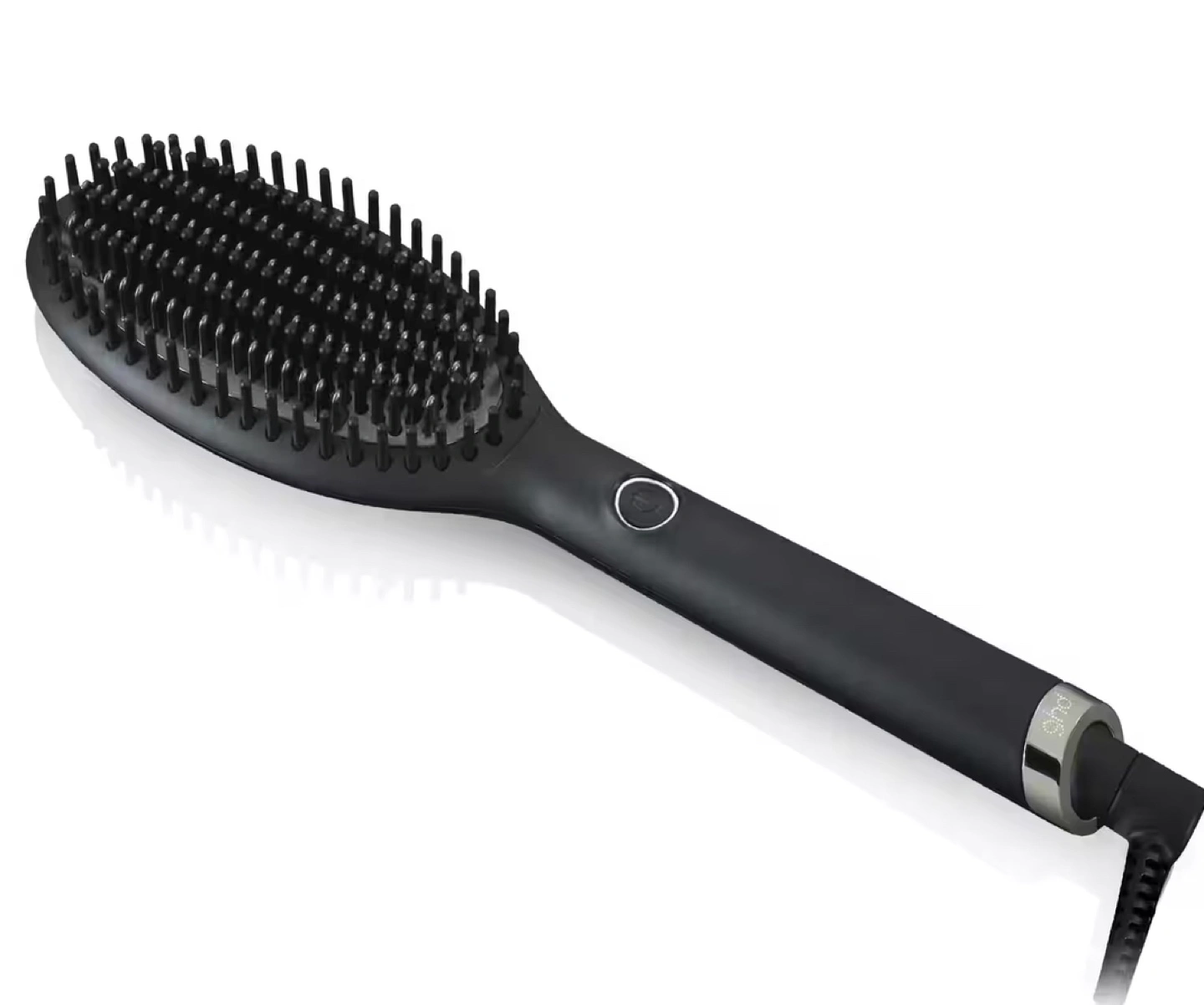 Black ghd Glide hot styling brush. Ceramic technology with ionizer. Heats up in 25 seconds. Optimum styling temperature of 365°F.