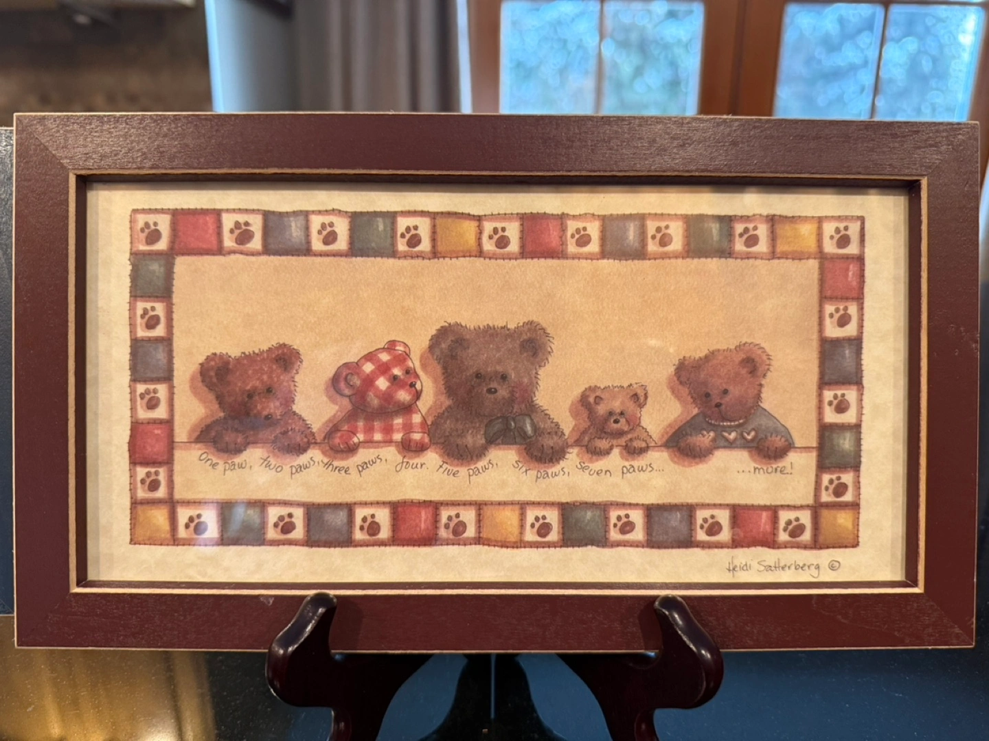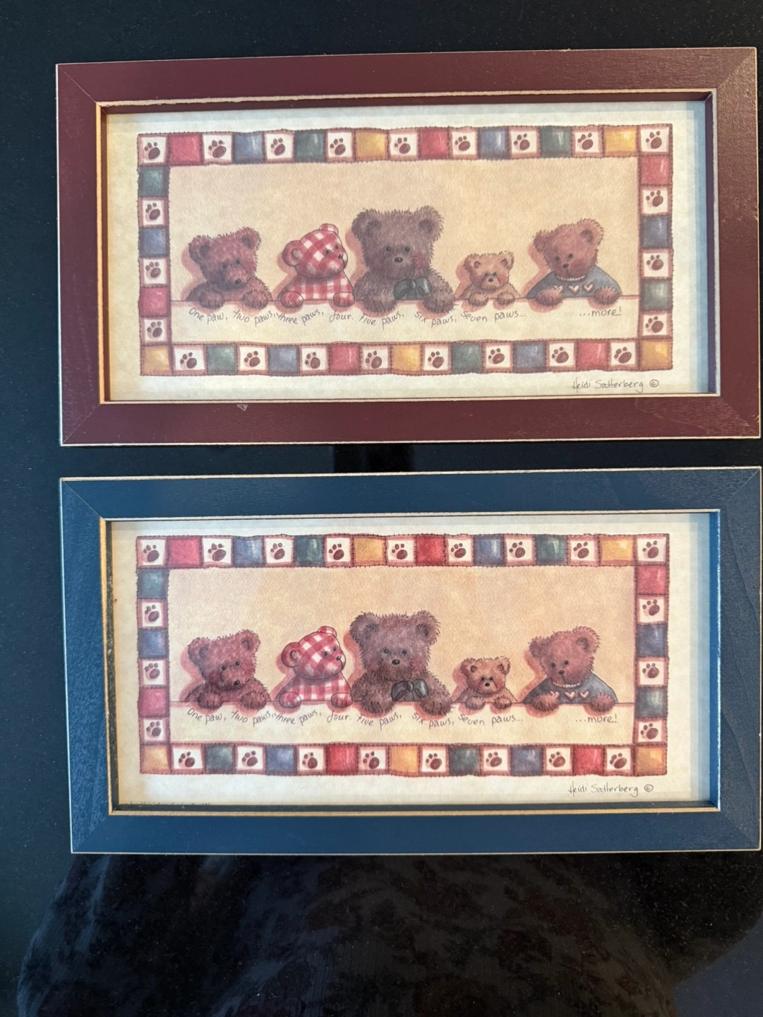 26Adorable framed prints featuring a line-up of teddy bears. Picturesque patchwork border. Wood frames. One Red, One Dk Blue. Perfect for a nursery or child's room. Ready to hang. Individually $7 each Stands not included Non Smoking Home Will consider reasonable offers