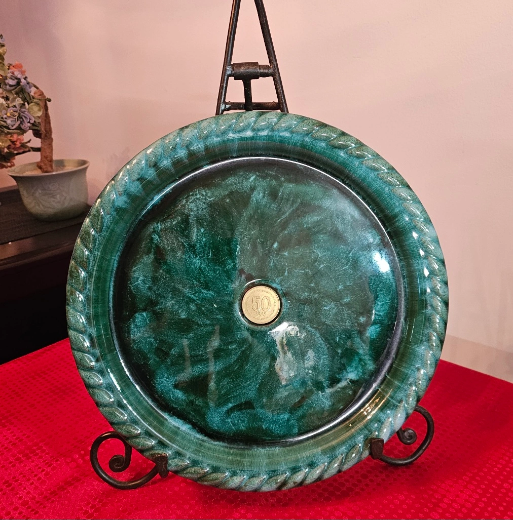 Beautiful Blue Mountain Sunoco 50th Anniversary Commemorative Ceramic zplate. Features a commemorative coin inset. Rope-like border. Made in Canada. 12 inches in Diameter.
