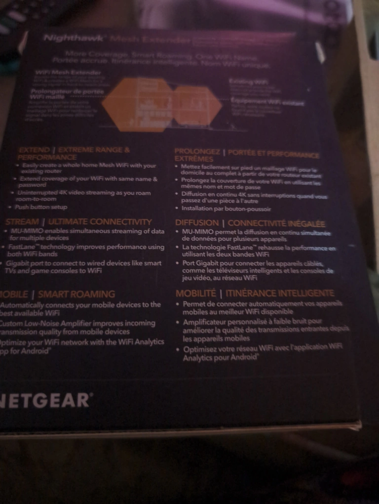 New Nighthawk X4 WiFi Mesh Extender. Smart roaming, one WiFi name. Extends range and performance. Uninterrupted 4K video streaming. Multiple devices simultaneous streaming. Gigabit ports. Connects to wired devices. Smart roaming for mobile devices.