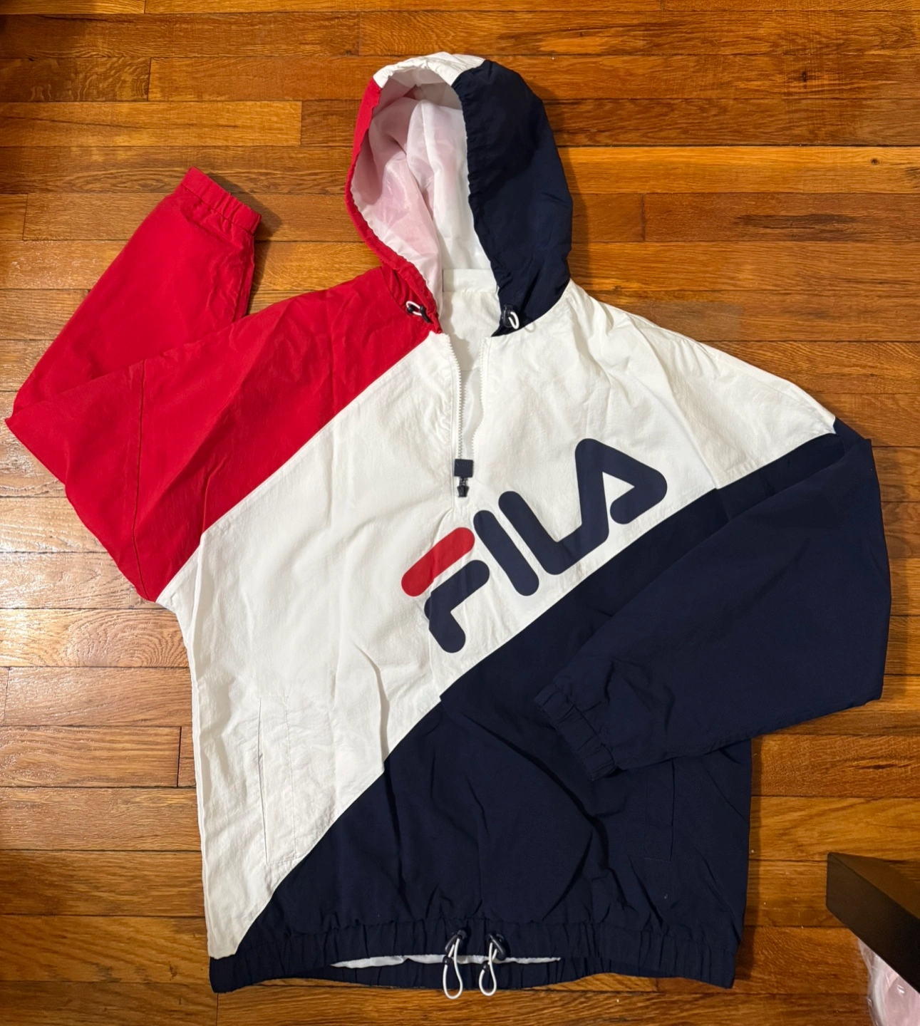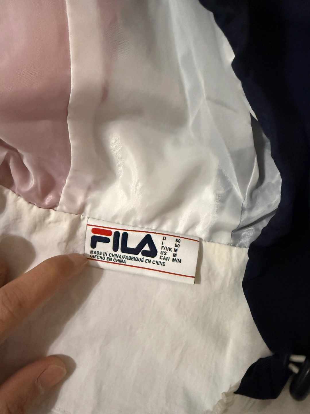 Vintage Fila windbreaker. Colorblocked design. Half zip closure. Drawstring waist. Hoody.