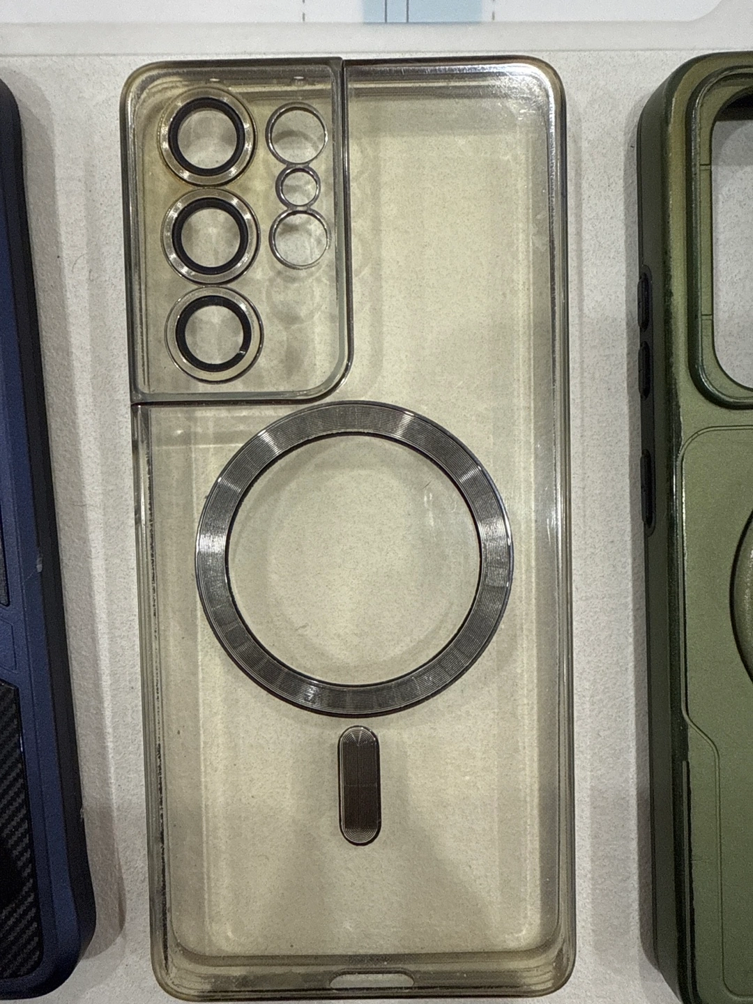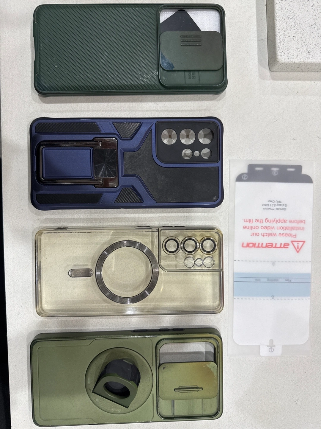 Lot of four phone cases. Green case with sliding camera cover. Blue case with kickstand. Clear case with magnetic ring. Another green case with kickstand and sliding camera cover. Pre-owned, some minor wear.