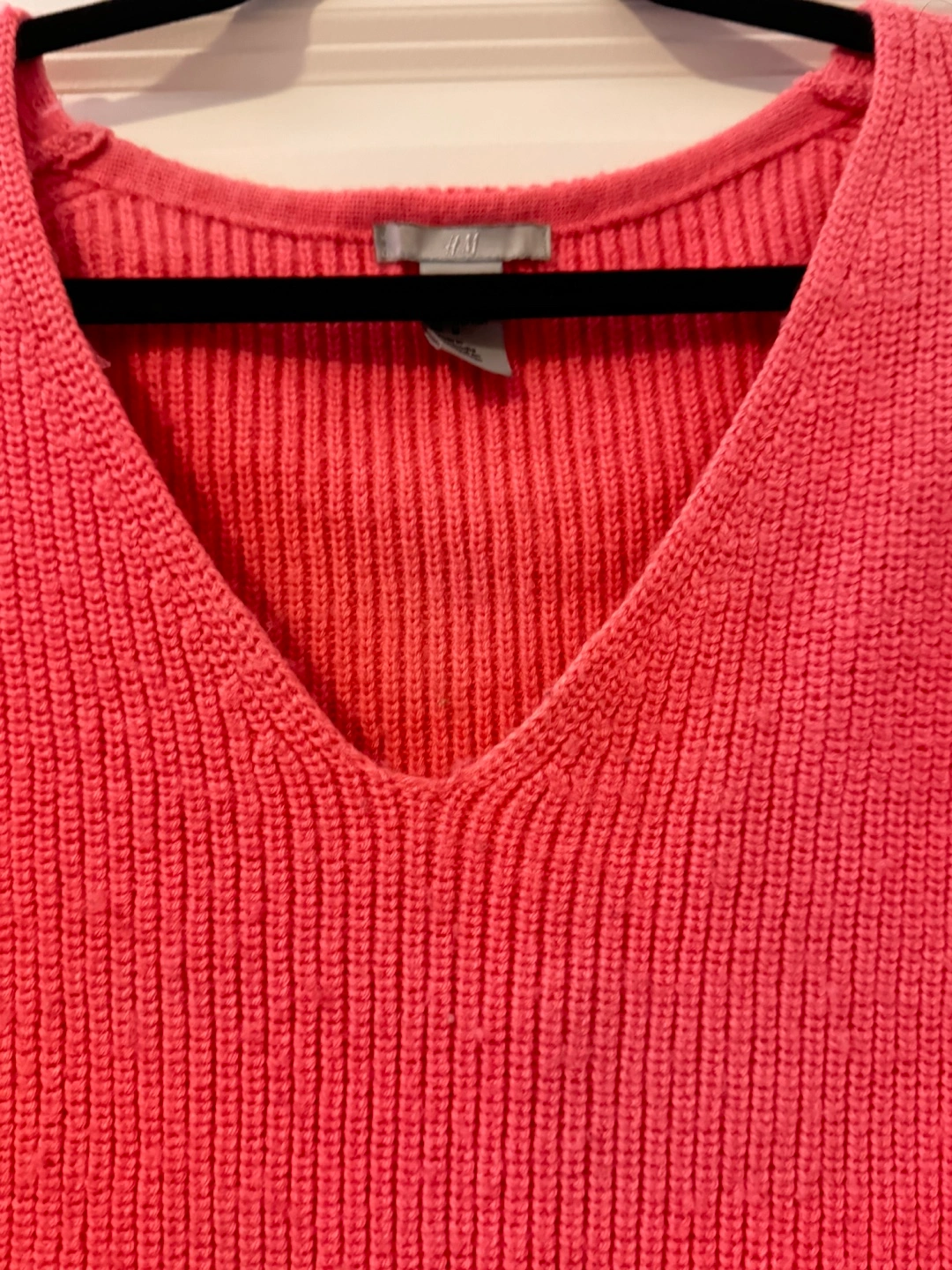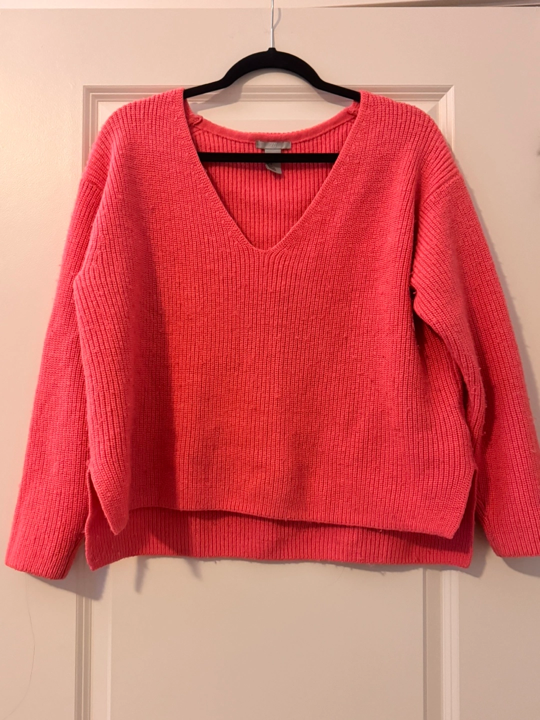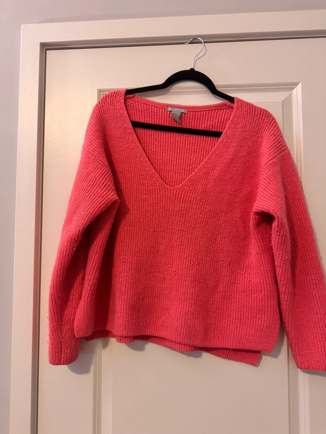 Women's pink V-neck sweater. Long sleeves, ribbed knit. Relaxed fit, cropped length. Soft material, great for layering.
