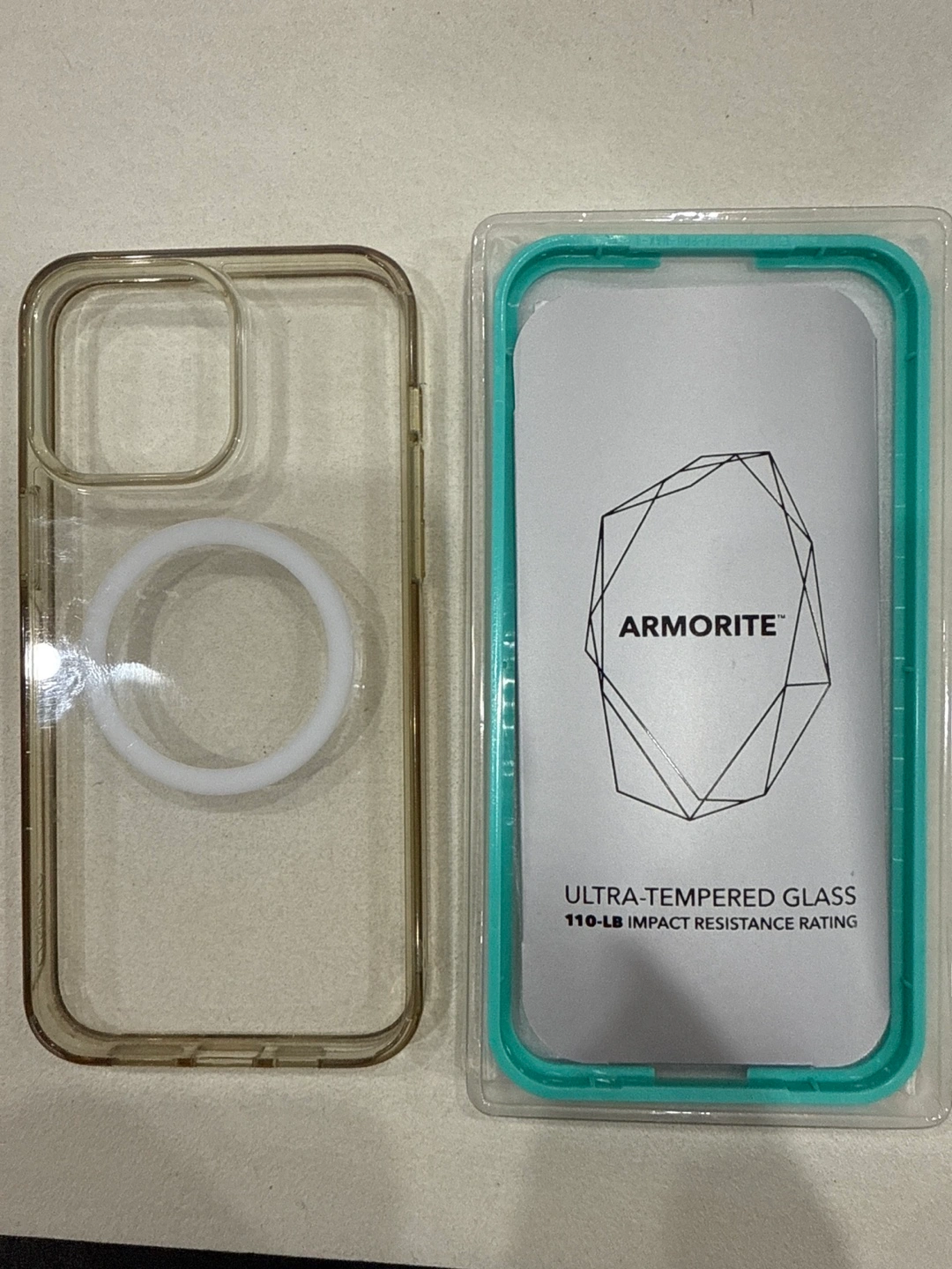 Clear phone case with ring holder. Includes Armorite ultra-tempered glass screen protector(1pc). 110-lb impact resistance rating. iPhone 14 Pro Max