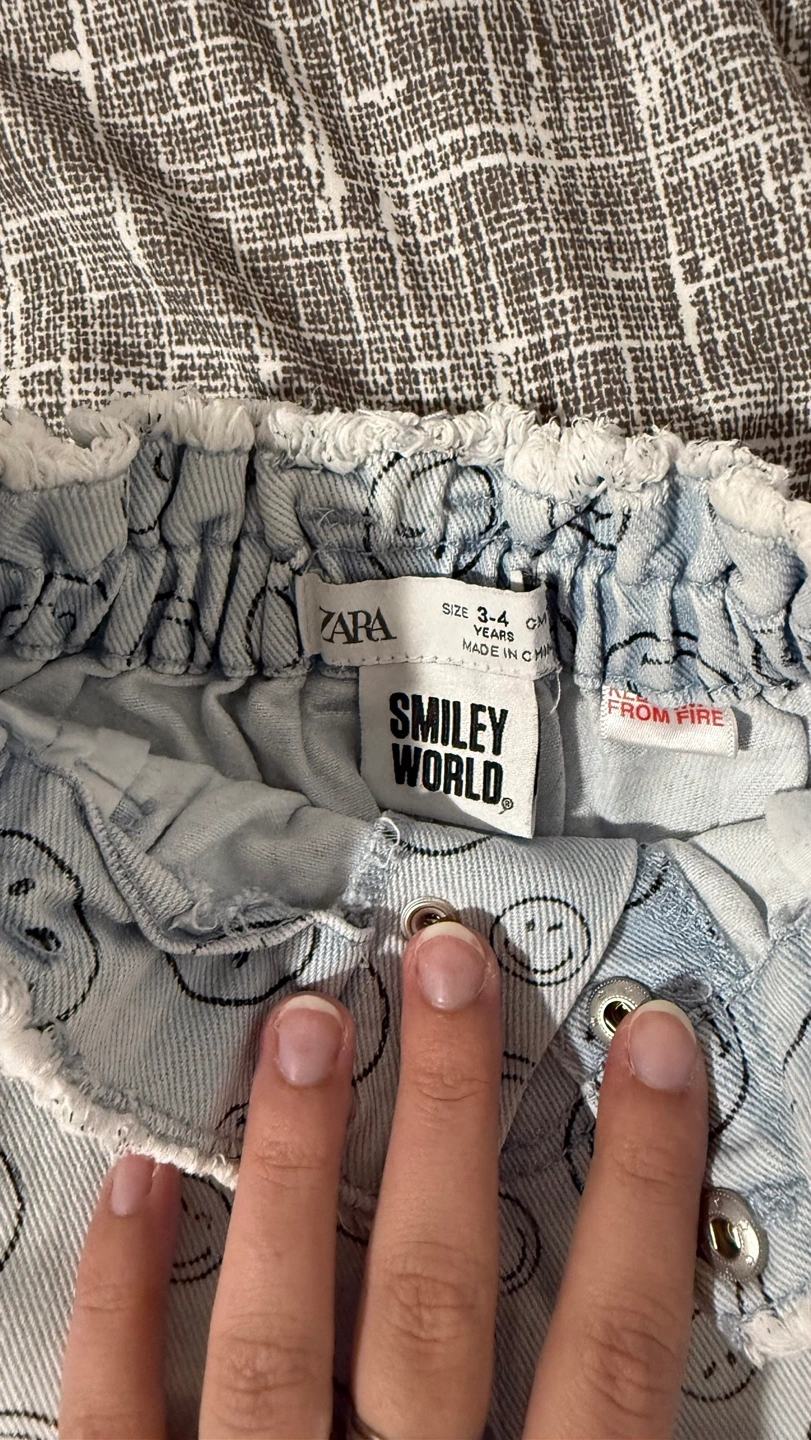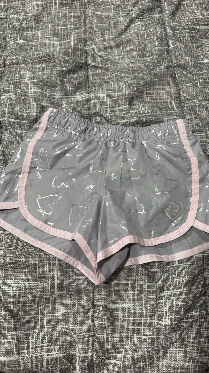 Bundle of four girls' shorts. Includes one pair of pink denim shorts, one pair of grey shorts with silver hearts, one pair of pink athletic shorts with grey trim and one jean shorts with smiley faces. Sizes vary.