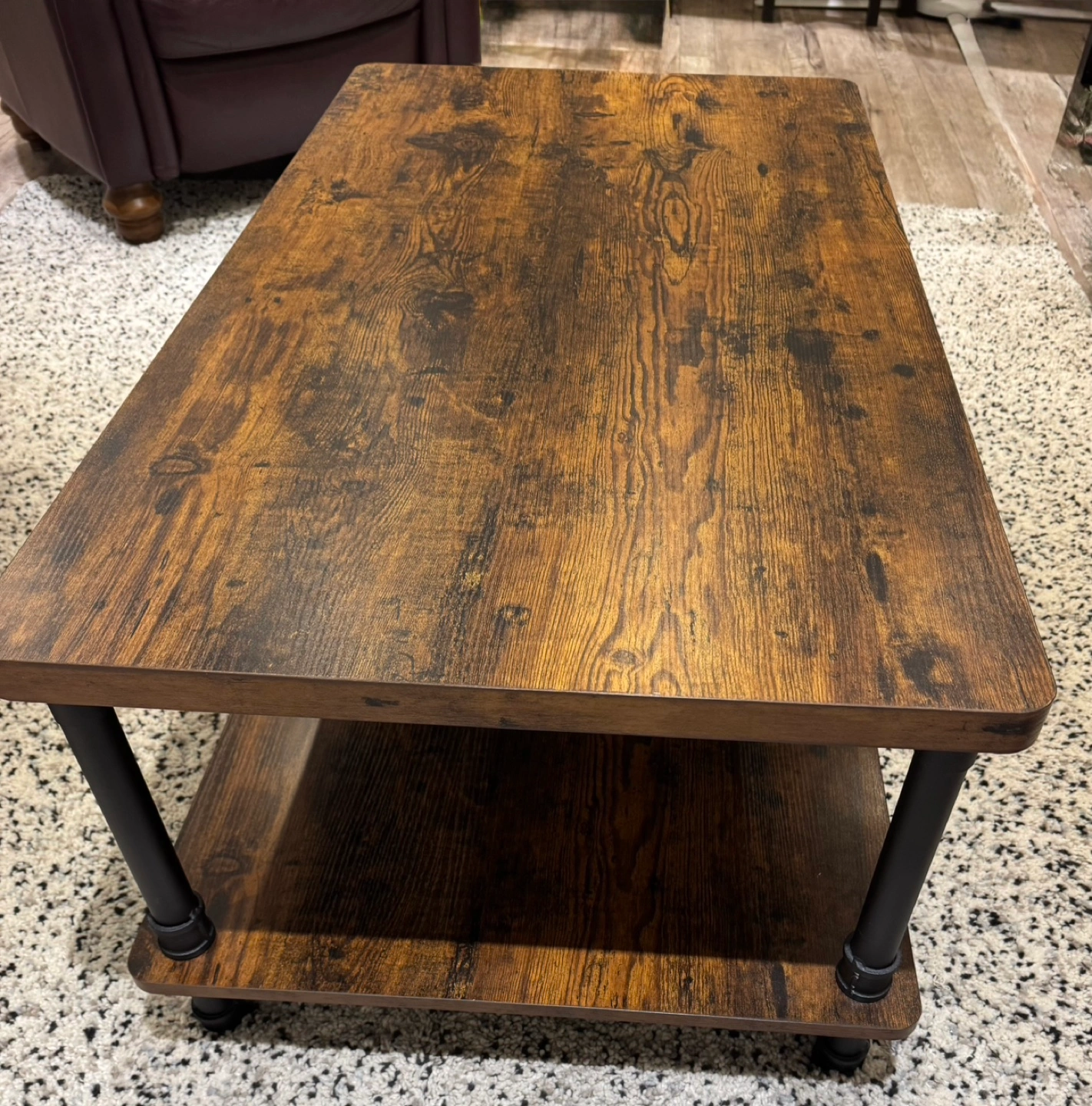Two-tiered coffee table. Dark brown wood finish. Black metal pipe legs. Great for living room.