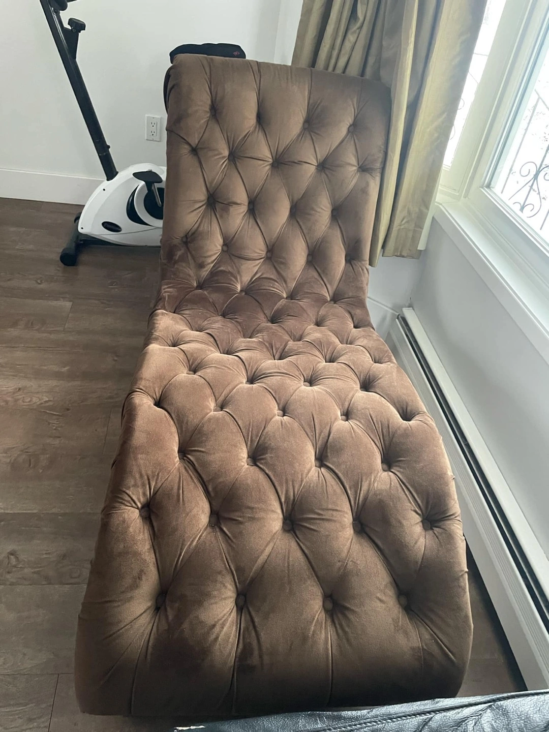 Button-tufted chaise lounge. Brown velvet upholstery. Curved design. Wooden legs. Comfortable and stylish.