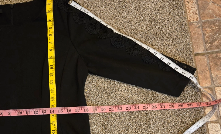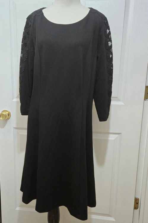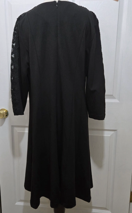 Elevate your wardrobe with this pre-owned solid black A-line dress from Talbots. Designed with a feminine and classic touch, this dress features a round neckline, long sleeves, and a zipper closure. The dress is made from a high-quality polyester blend fabric. Perfect for any occasion, this knee-length dress is suitable for both casual and formal events. This dress is available in size 16 Petite (approximately a size large see pictures for measurements) and is perfect for women of all ages and sizes. Add this dress to your wardrobe today and enjoy a stylish and comfortable look every time you wear it.