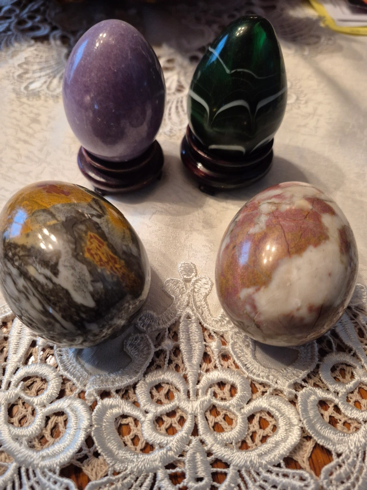 Collection of four decorative stones, each shaped like an egg and sitting on a small wooden stand. Variety of colours and patterns. Perfect for display or collection.