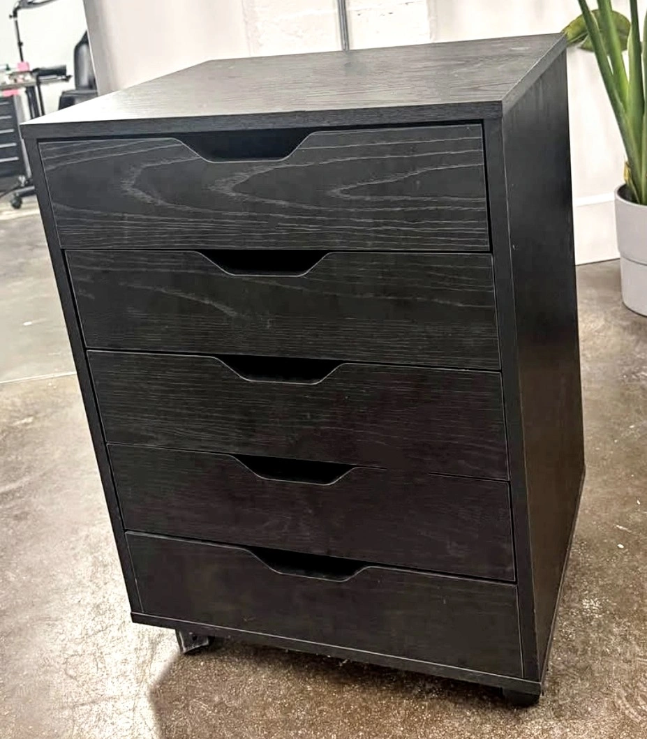 Five-drawer rolling filing cabinet. Black wood finish. Perfect for files and paper organization. Mobile on casters. It is 26 inches in height approximately.