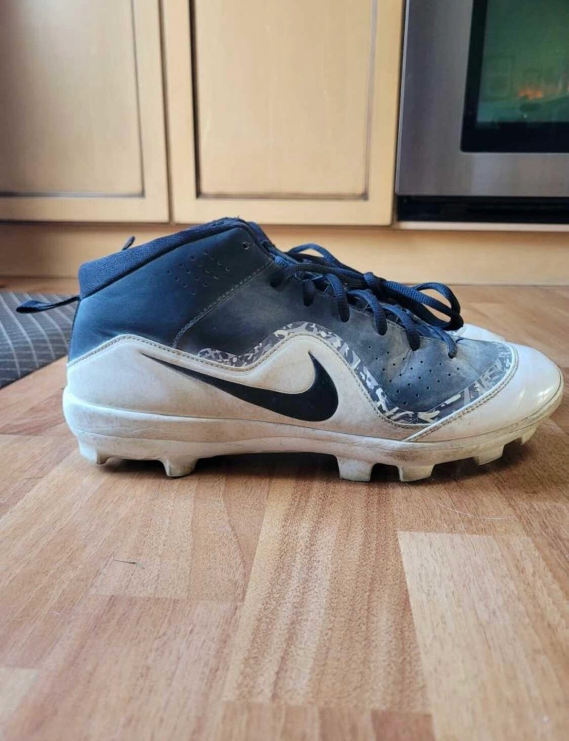 Size 10 Used Nike Trout 2 Pro MCS baseball cleats. Mid-cut design. Black and white colour scheme. Tread in good condition. Work for one season