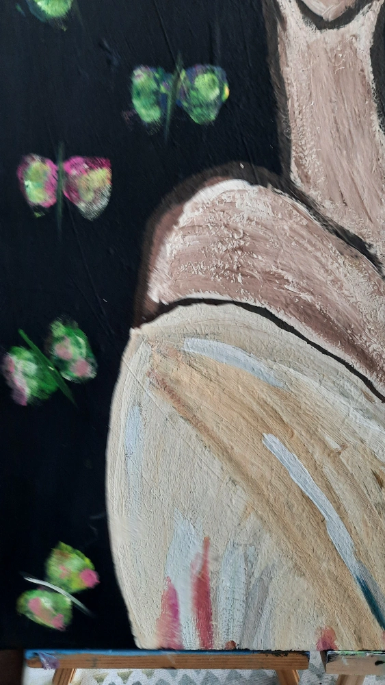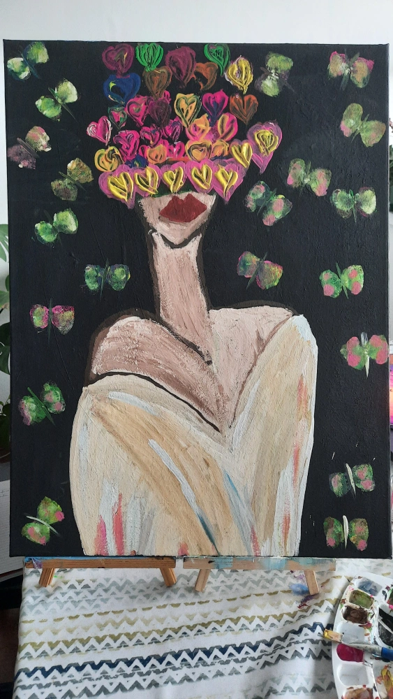 Large colourful acrylic painting on canvas. Depicts a woman with hearts for a face surrounded by butterflies. Unique artwork, great for home decor. Textured brushstrokes.