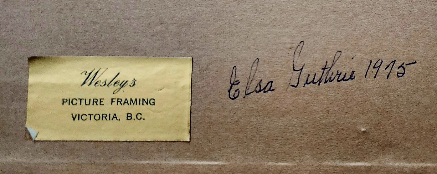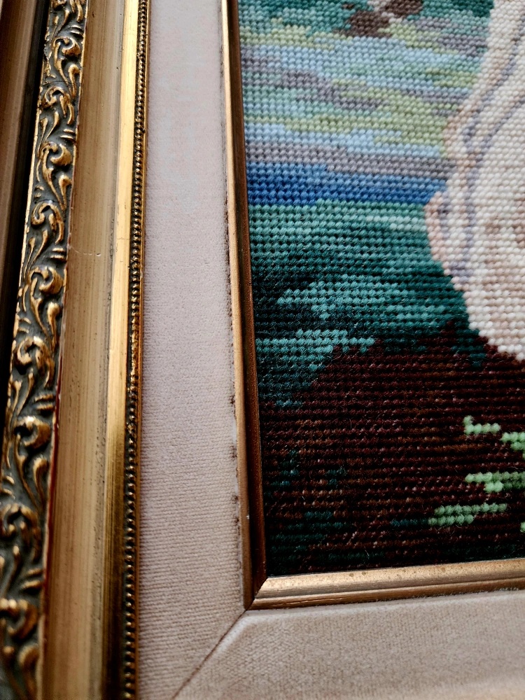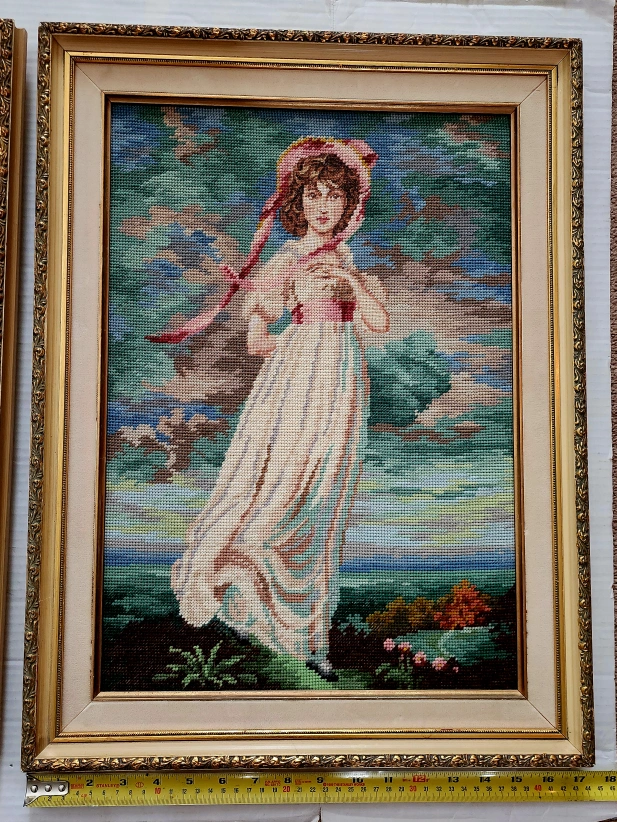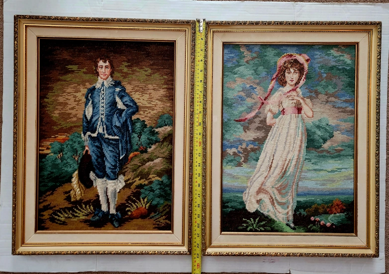 Two framed needlepoint pictures. Depict a man and a woman in period clothing. Gold coloured frames. Signed and dated 1975. Framed by Wesley's Picture Framing, Victoria, B.C.
