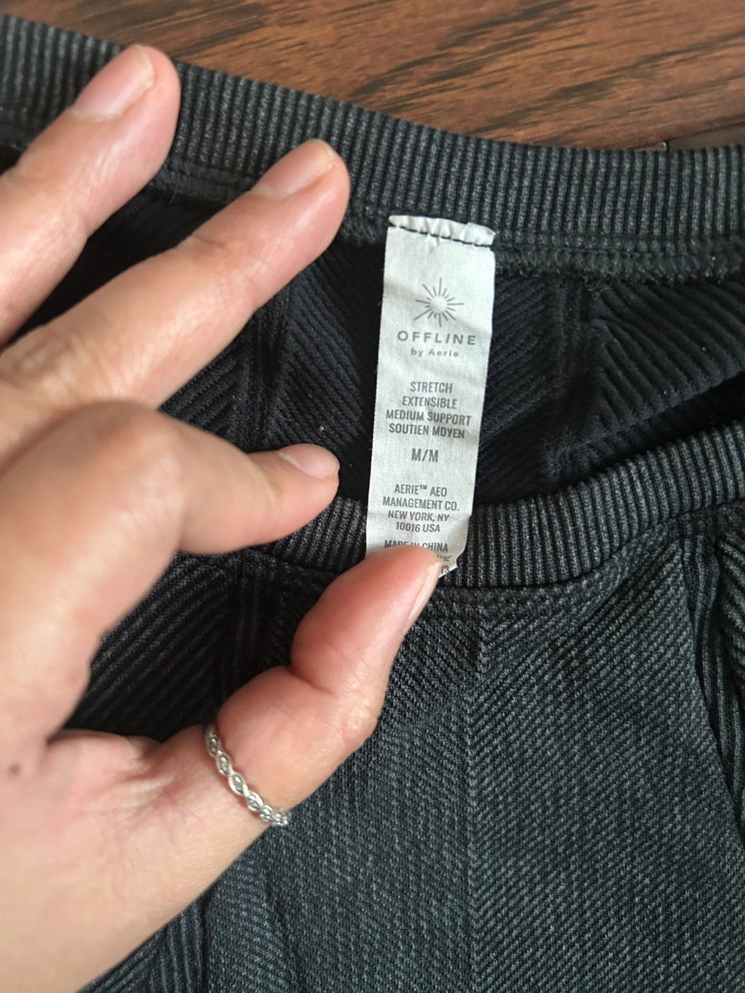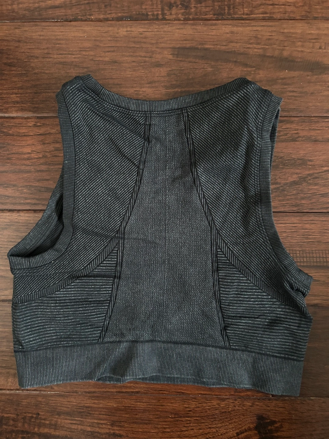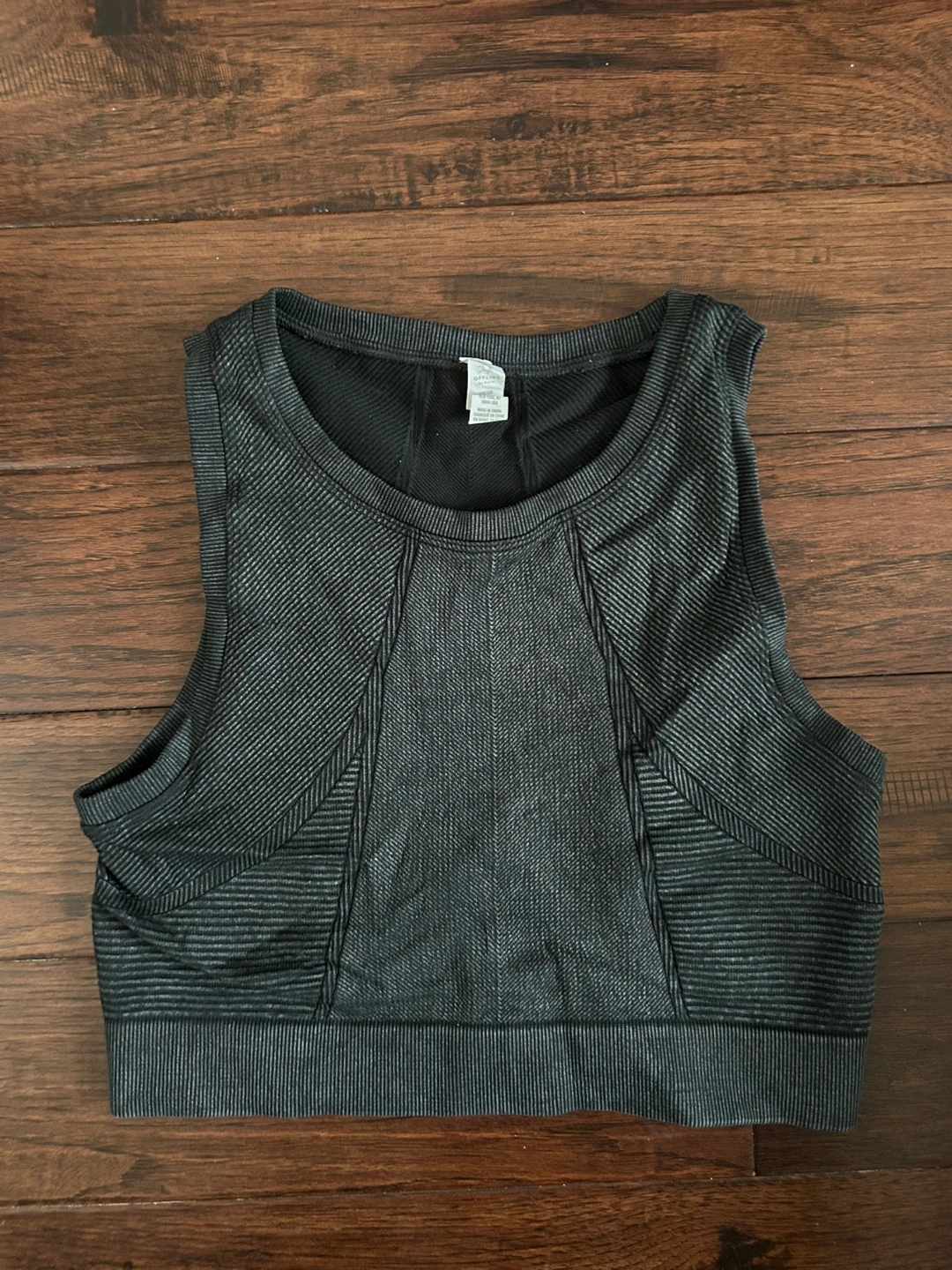 Dark grey sports bra. Medium size. Stretchy with light to medium support. Features ribbed fabric and unique stitching details.