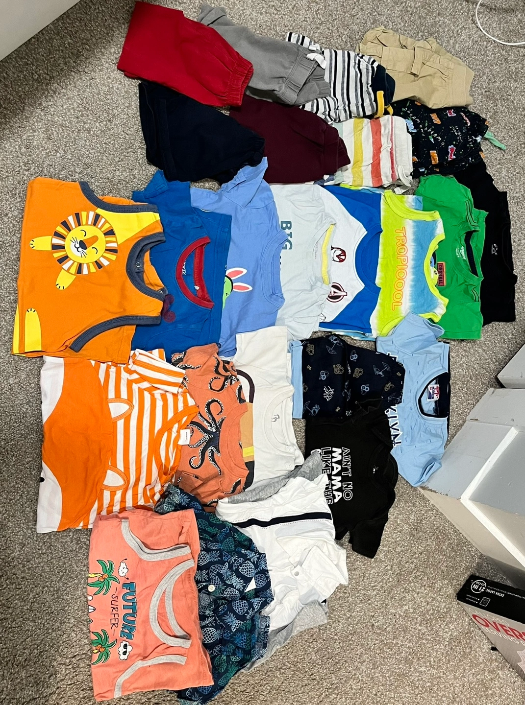 Large bundle of toddler boy's clothing. Includes shirts, tank tops, and pants. Sizes vary. Several brands included.