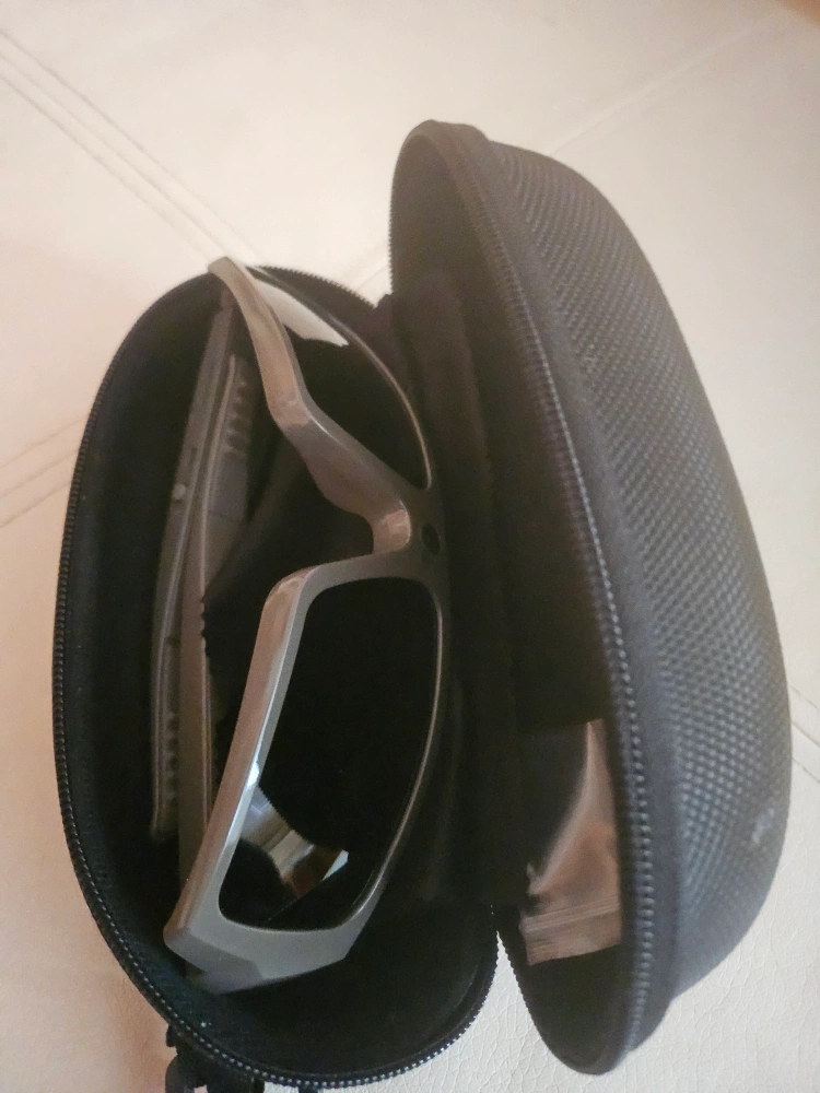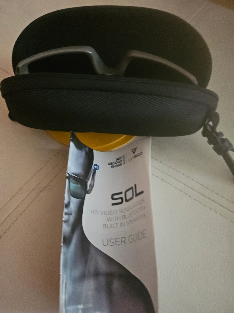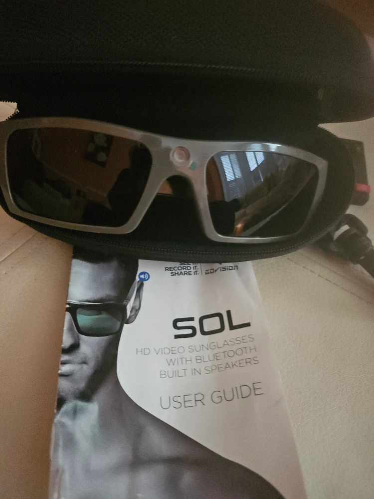 Gray HD video sunglasses. Includes carrying case and user guide. Bluetooth enabled with built-in speakers. Record and share videos.