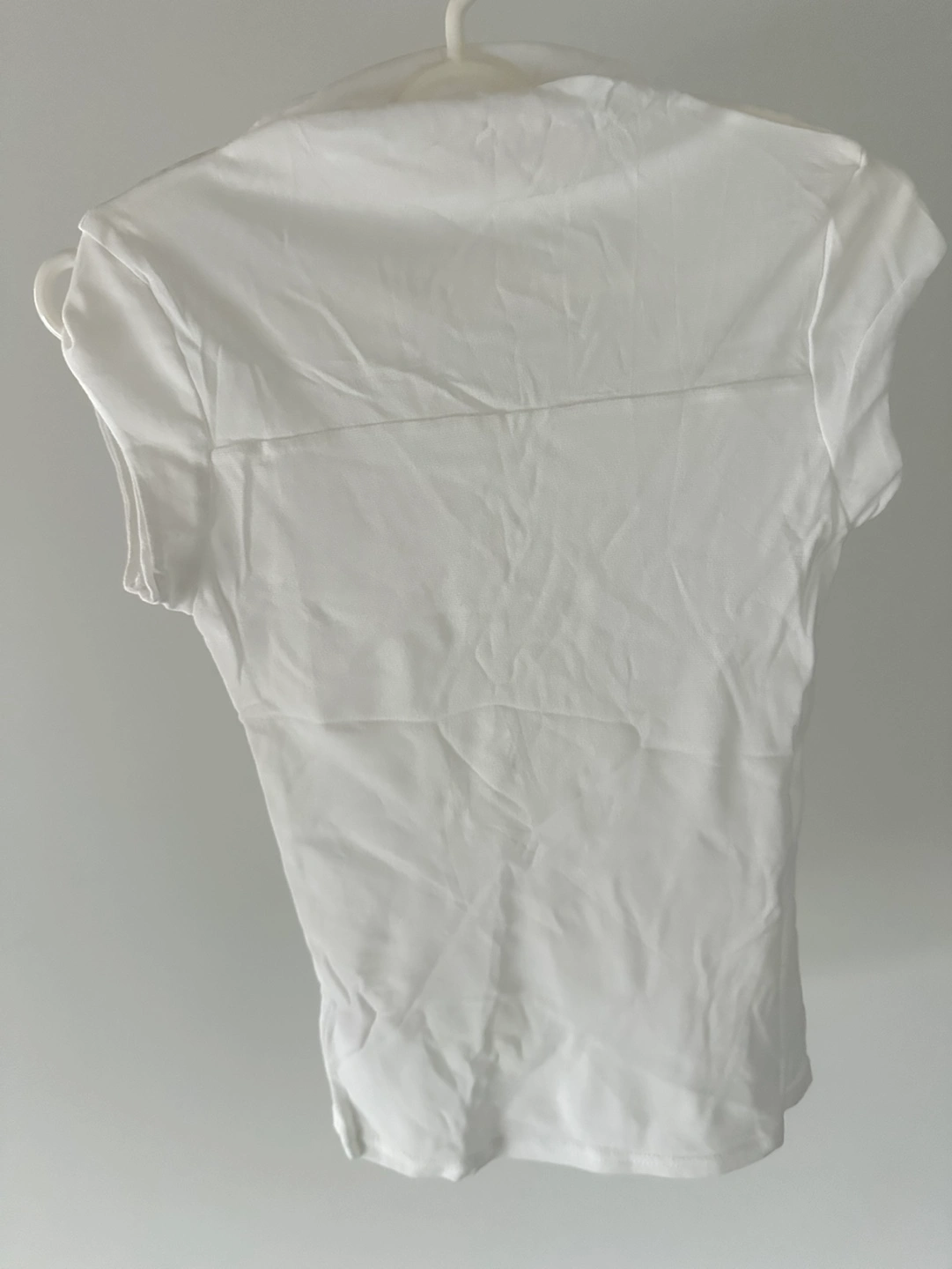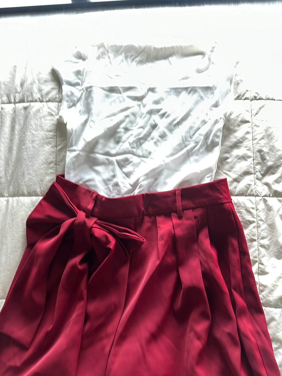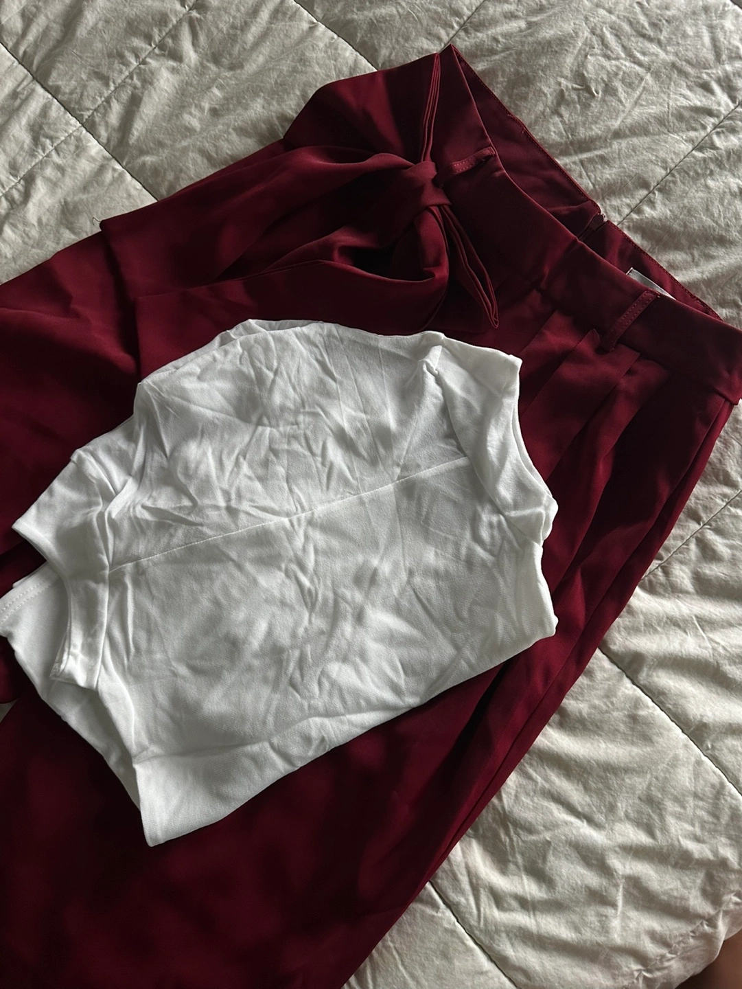 Stylish two-piece outfit. Features a white cropped short-sleeved top and burgundy culotte pants with a bow detail. Perfect for a casual yet chic look. Great for summer.