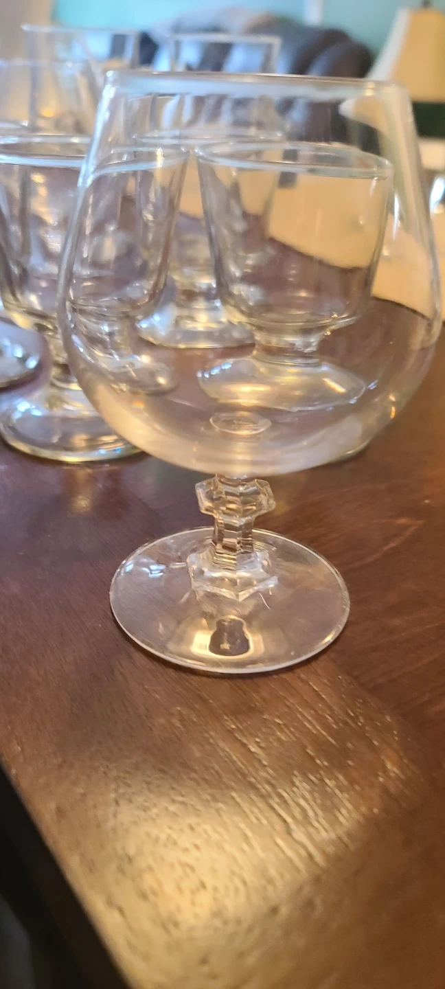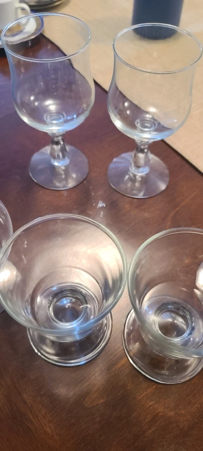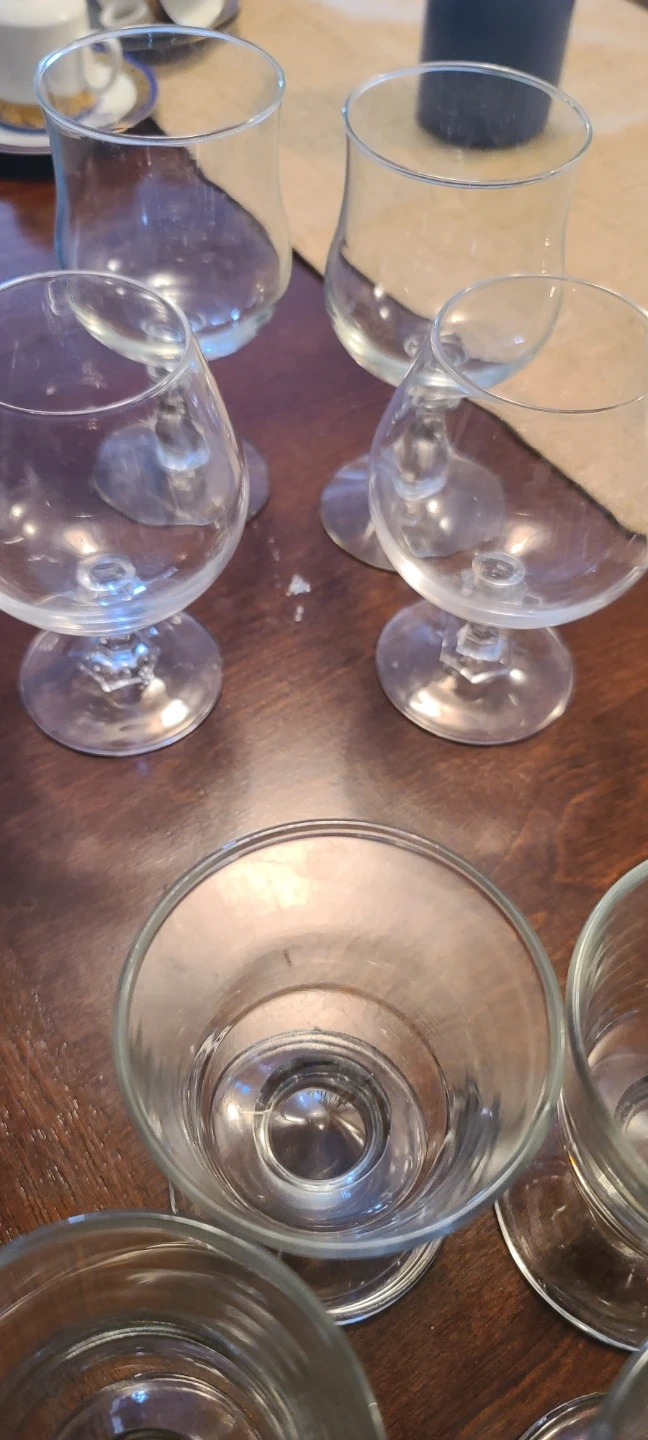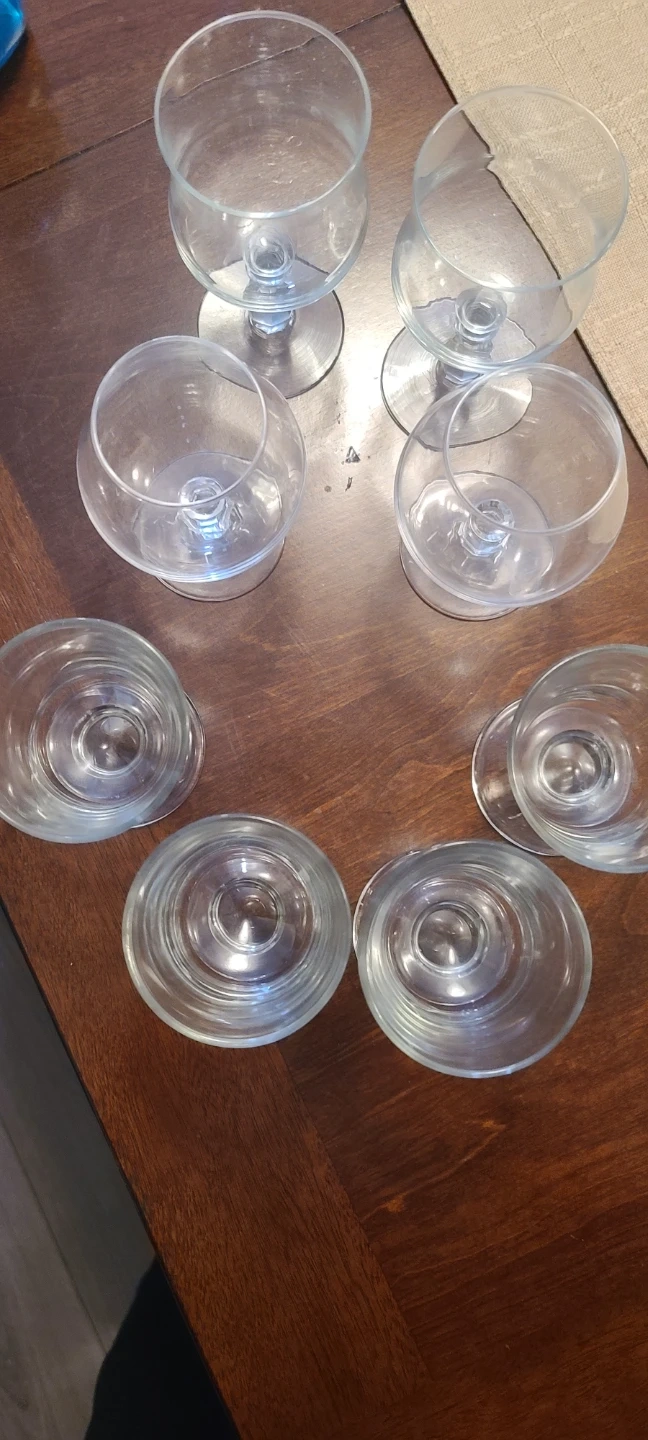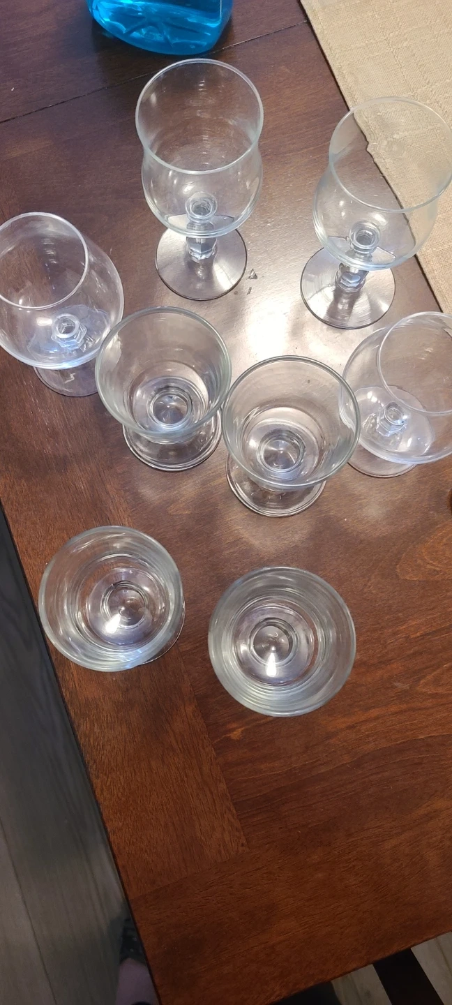A collection of eight assorted glass pieces, including stemmed wine glasses and shot glasses. These clear glass items are perfect for serving a variety of beverages at gatherings. They're made of durable glass and ready for your next get-together!
