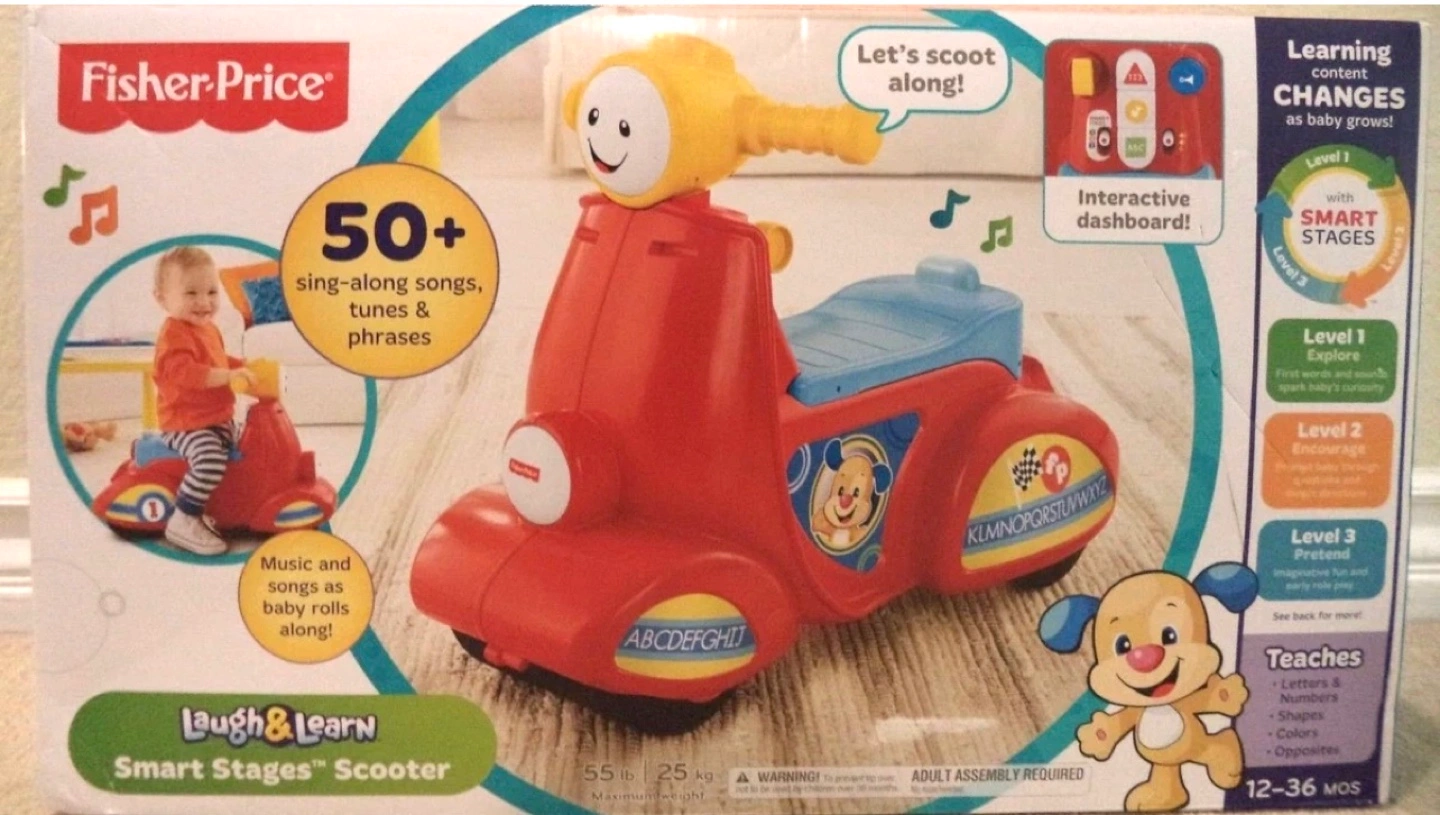 The Fisher-Price Laugh & Learn Smart Stages Scooter is perfect for little ones aged 12-36 months! It features an interactive dashboard with 50+ sing-along songs, tunes & phrases. Your baby will love exploring the different levels of learning content as they grow!
