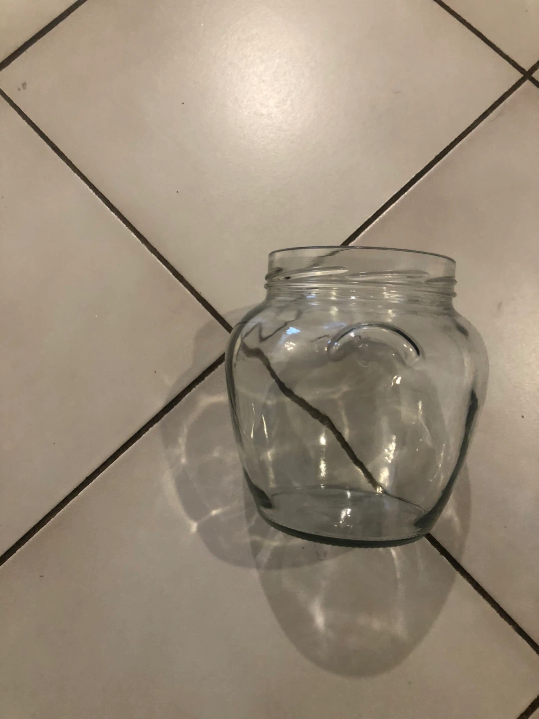 Clear glass jar with a wide opening. It's great for storing dry goods or crafts. Ideal for home organization!