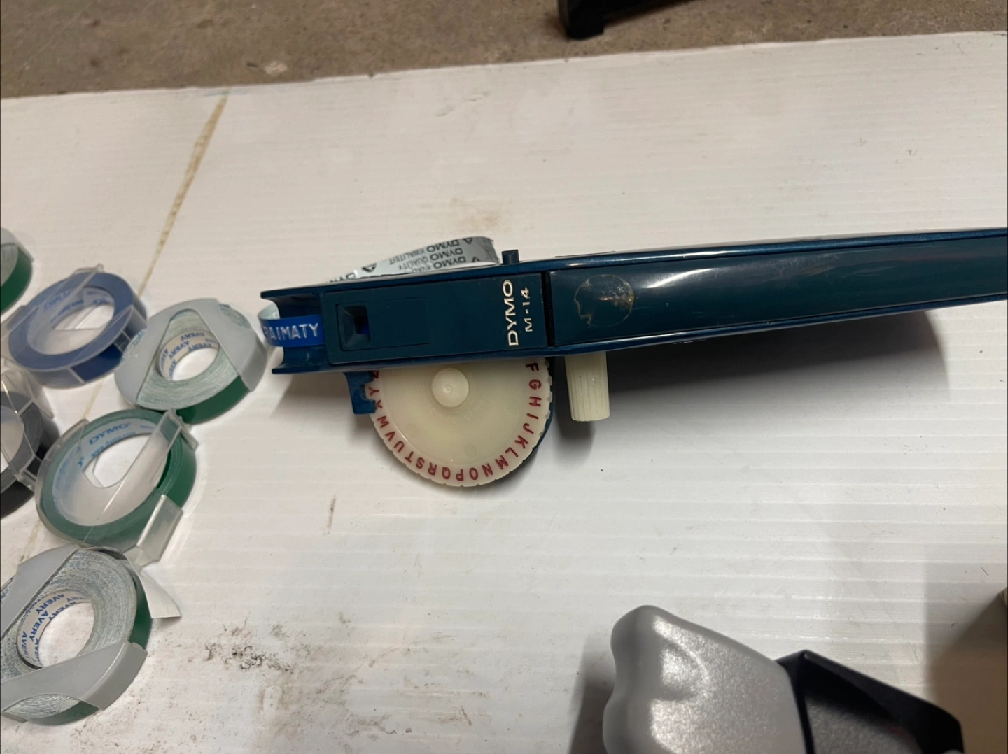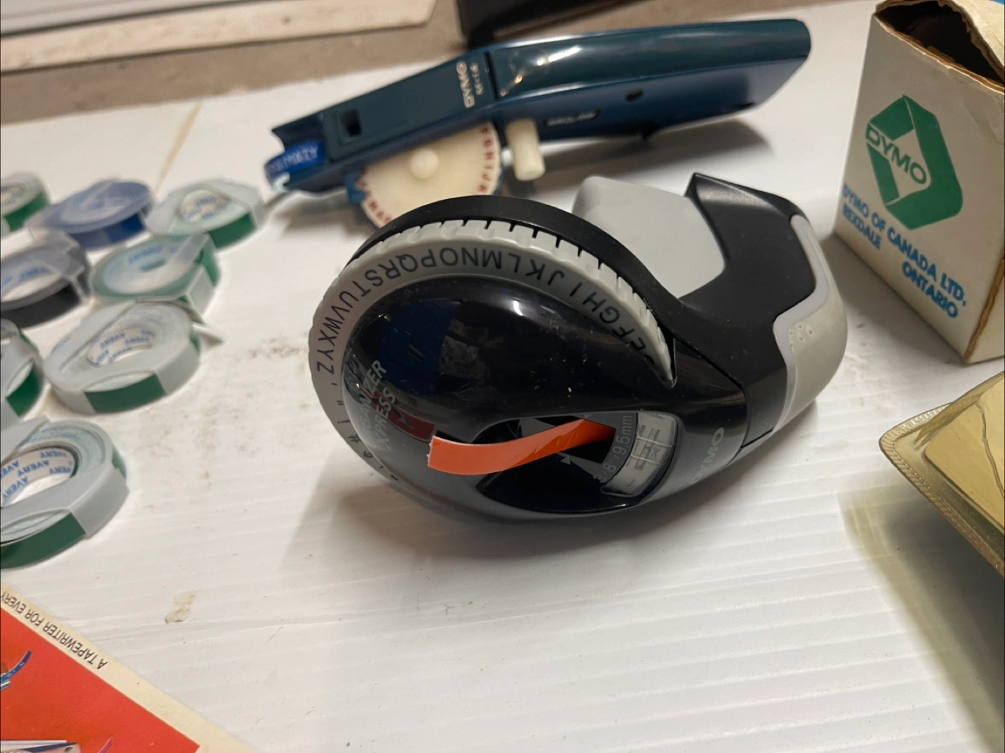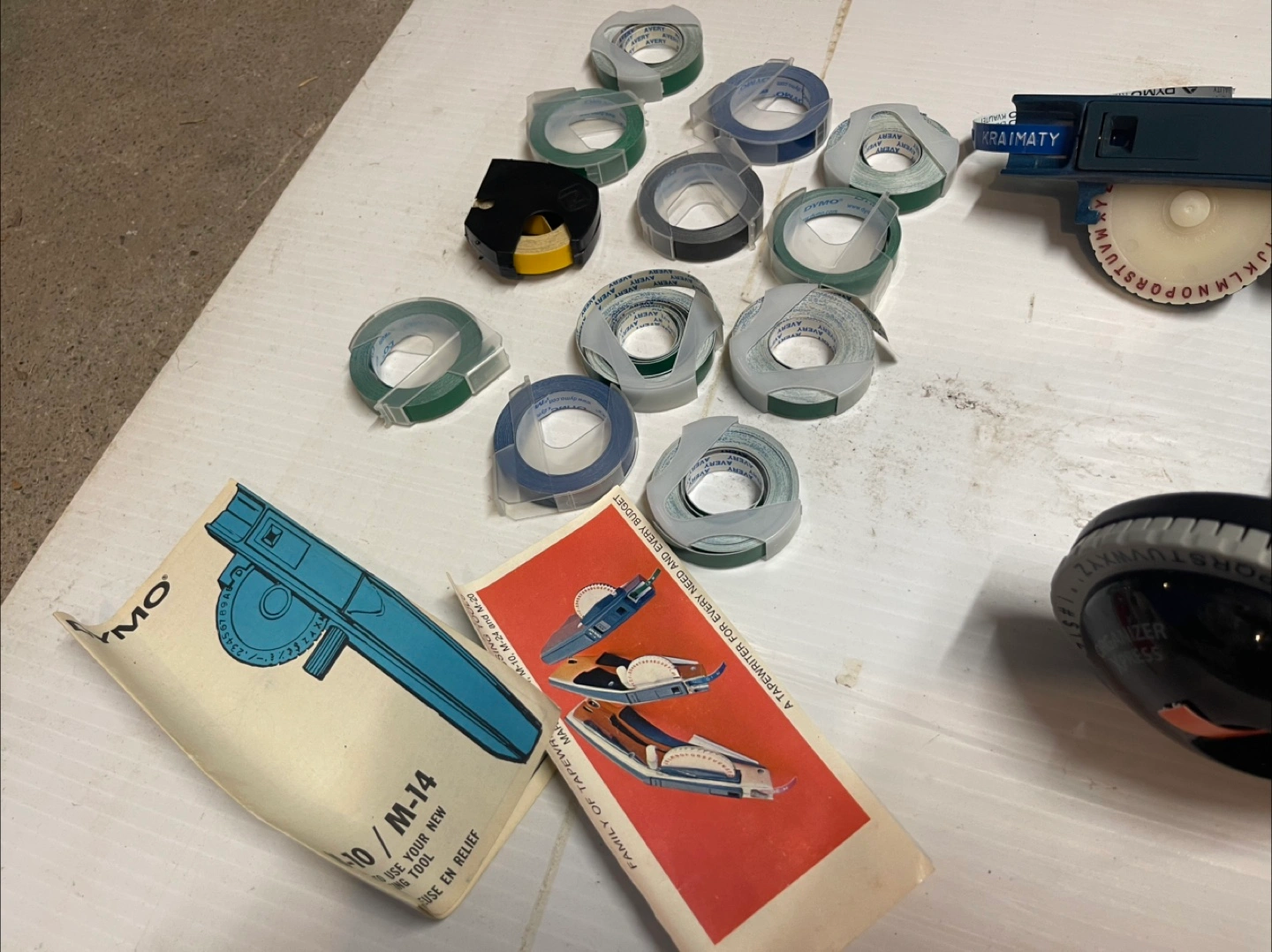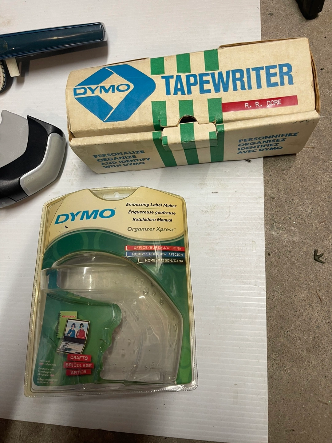 Collection of Dymo label makers and various rolls of tape. Includes older and newer models. Great for organizing and crafting.
