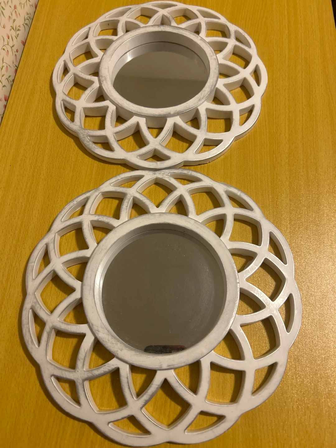 These are two white decorative wall mirrors. They have an intricate, openwork design around the central mirror. These mirrors add a nice touch to any wall!