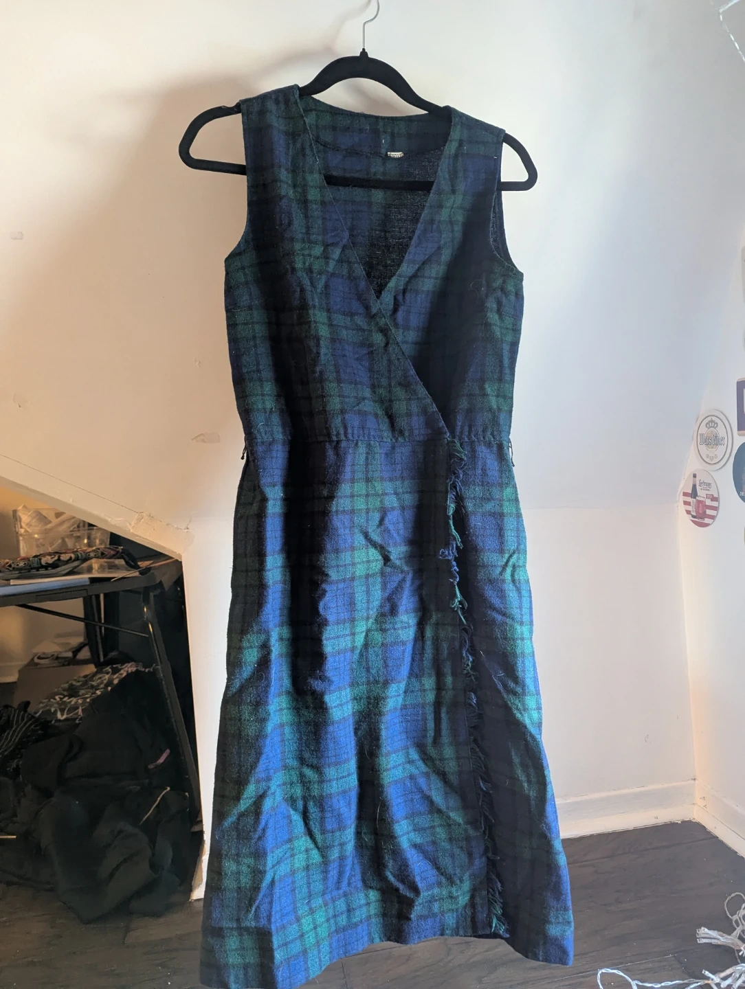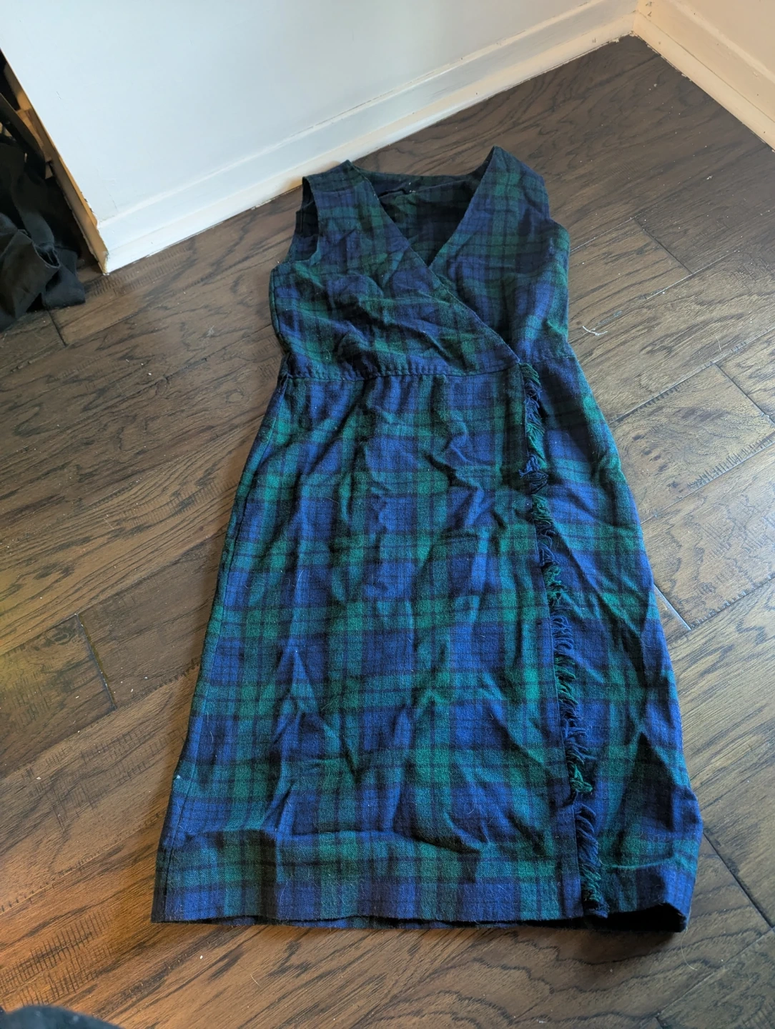 Sleeveless wrap dress in a classic blue and green tartan plaid pattern. It features a fringed hemline on the side slit.