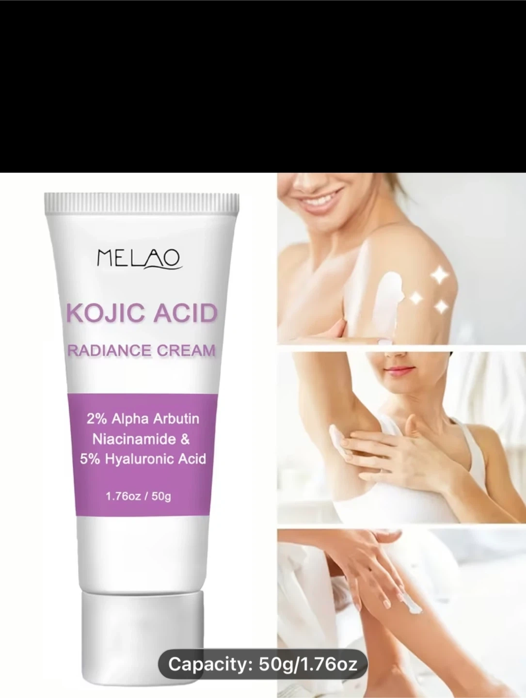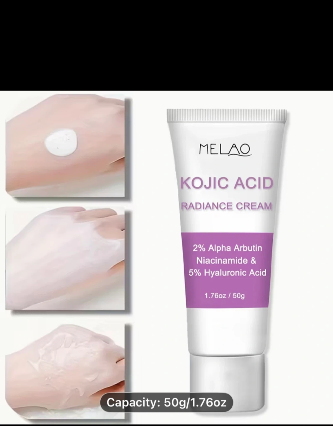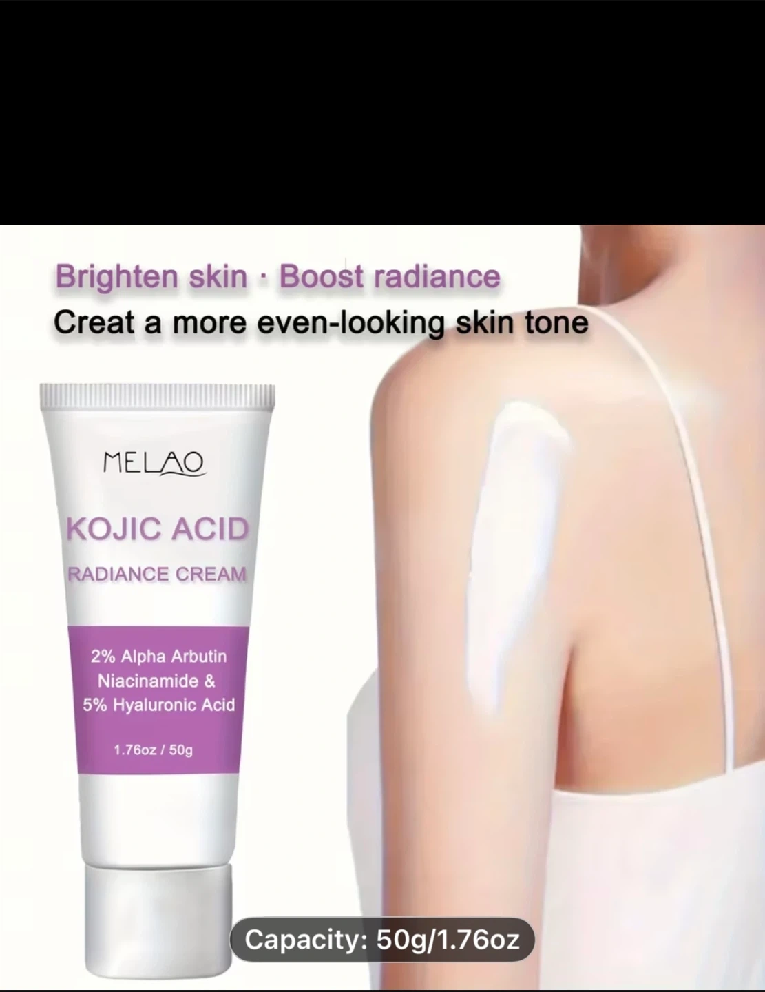 This Melao Kojic Acid Radiance Cream is formulated with 2% Alpha Arbutin, Niacinamide, and 5% Hyaluronic Acid. It's designed to brighten skin and boost radiance. The cream is 50g/1.76oz.