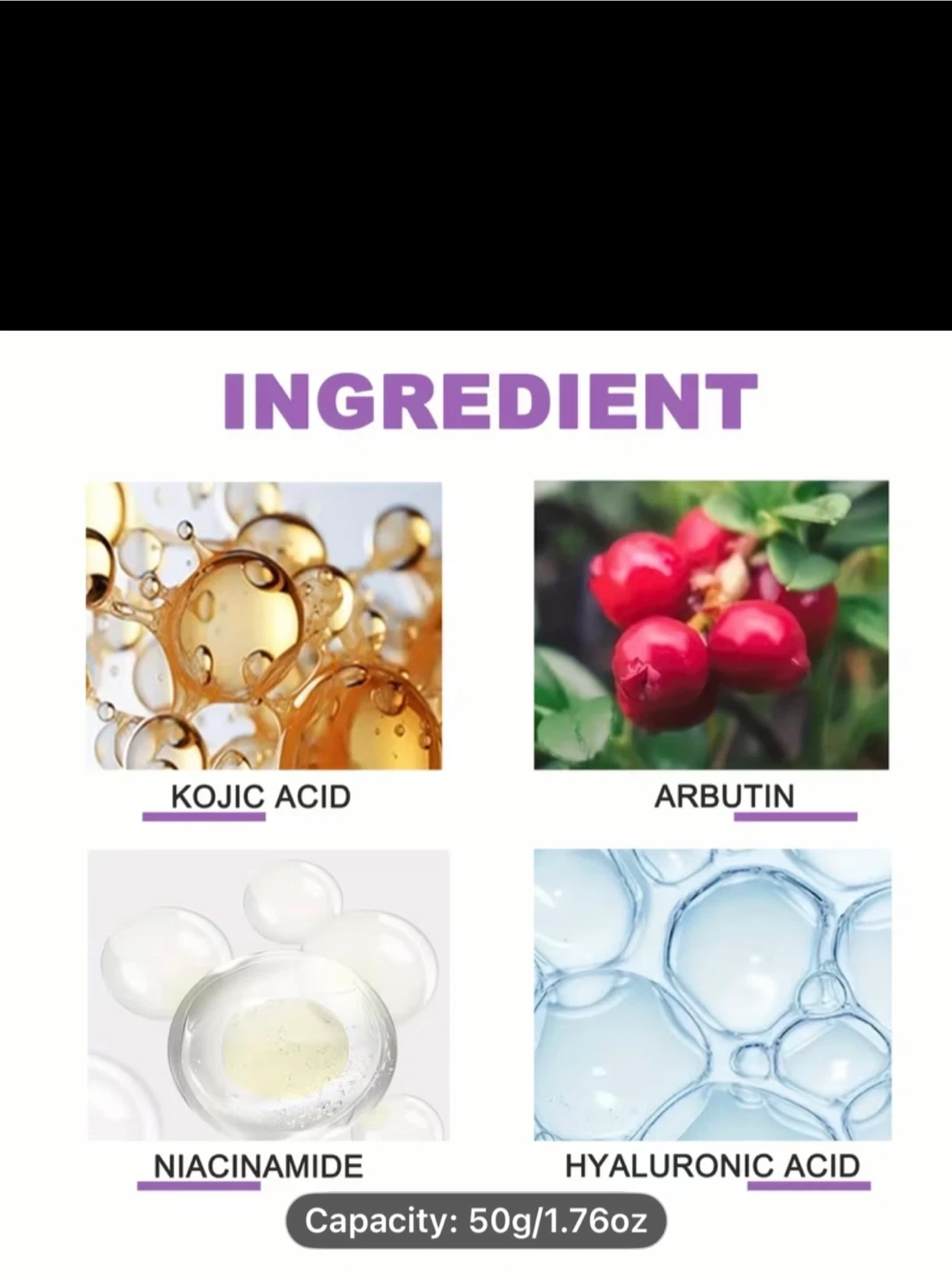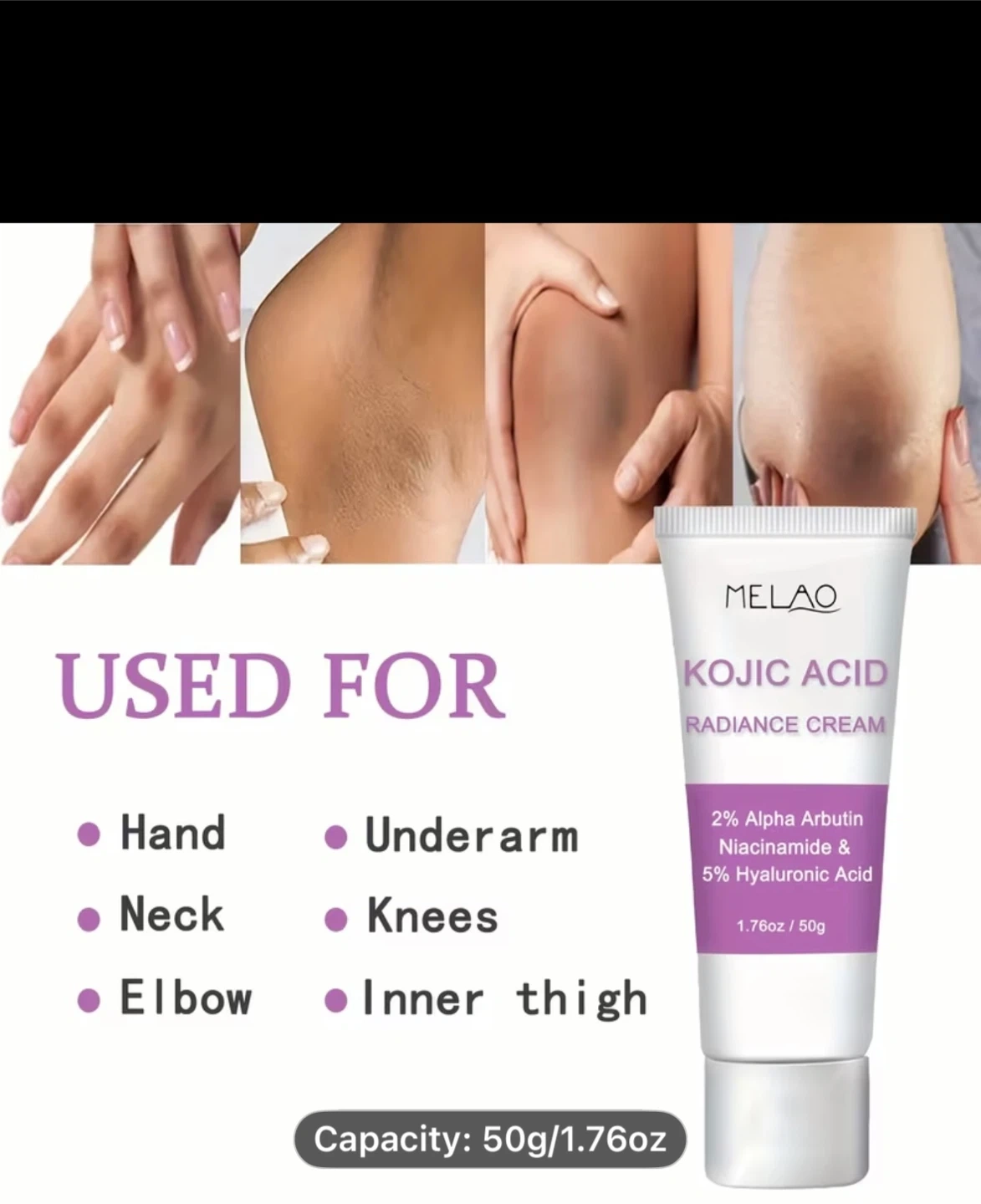 This Melao Kojic Acid Radiance Cream is formulated with 2% Alpha Arbutin, Niacinamide, and 5% Hyaluronic Acid. It's designed to brighten skin and boost radiance. The cream is 50g/1.76oz.