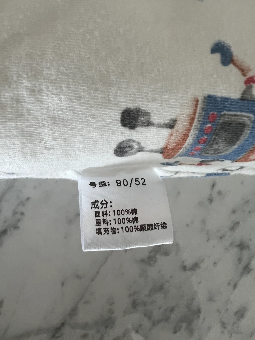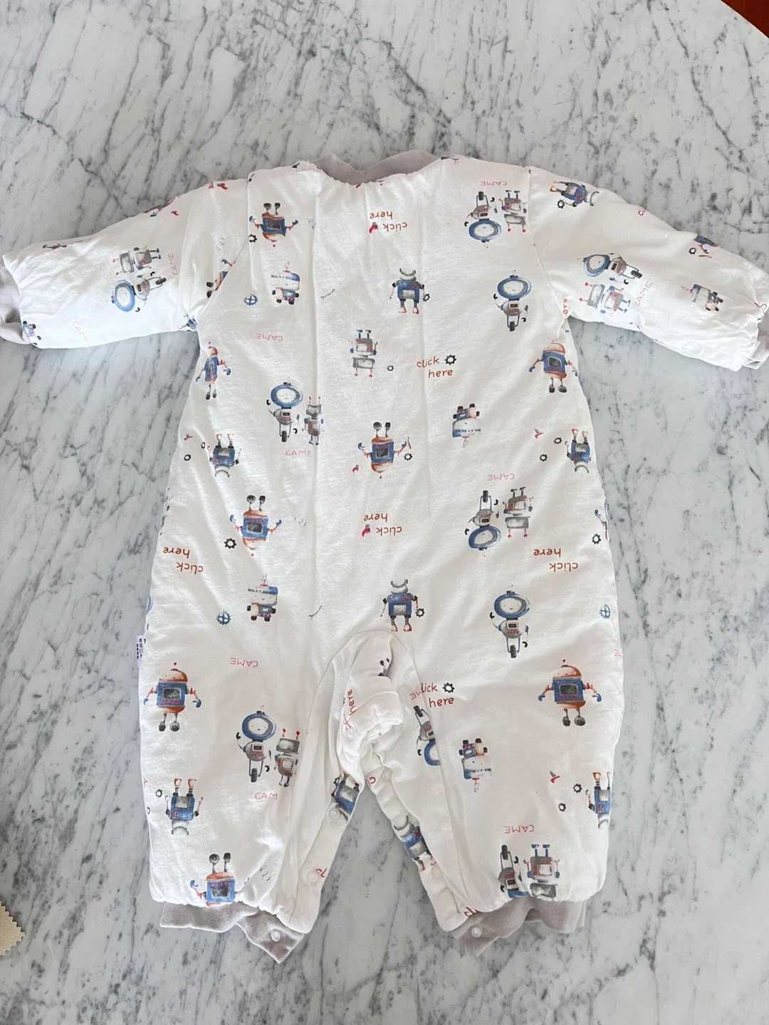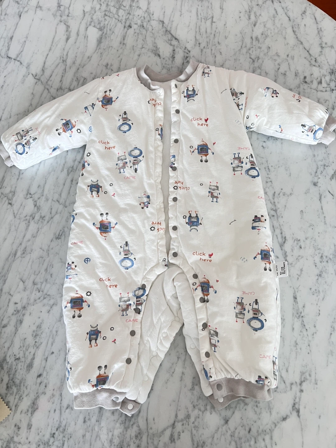 White baby snowsuit adorned with a fun robot print. Made from 100% cotton for the shell and filling. Size is 90/52.