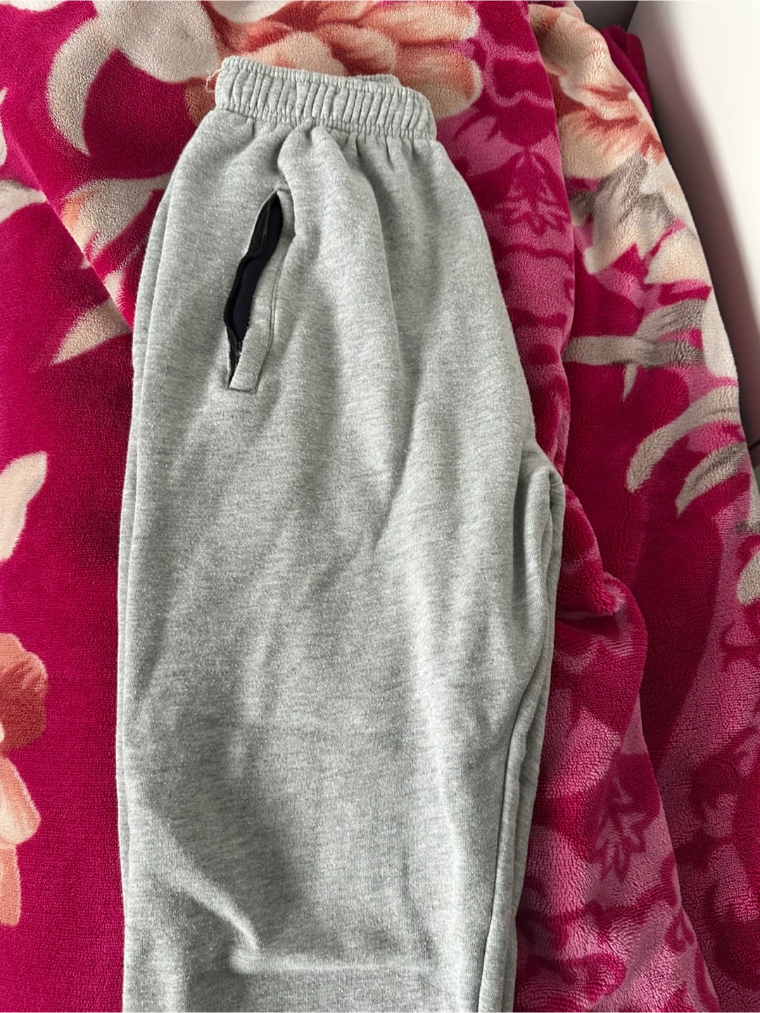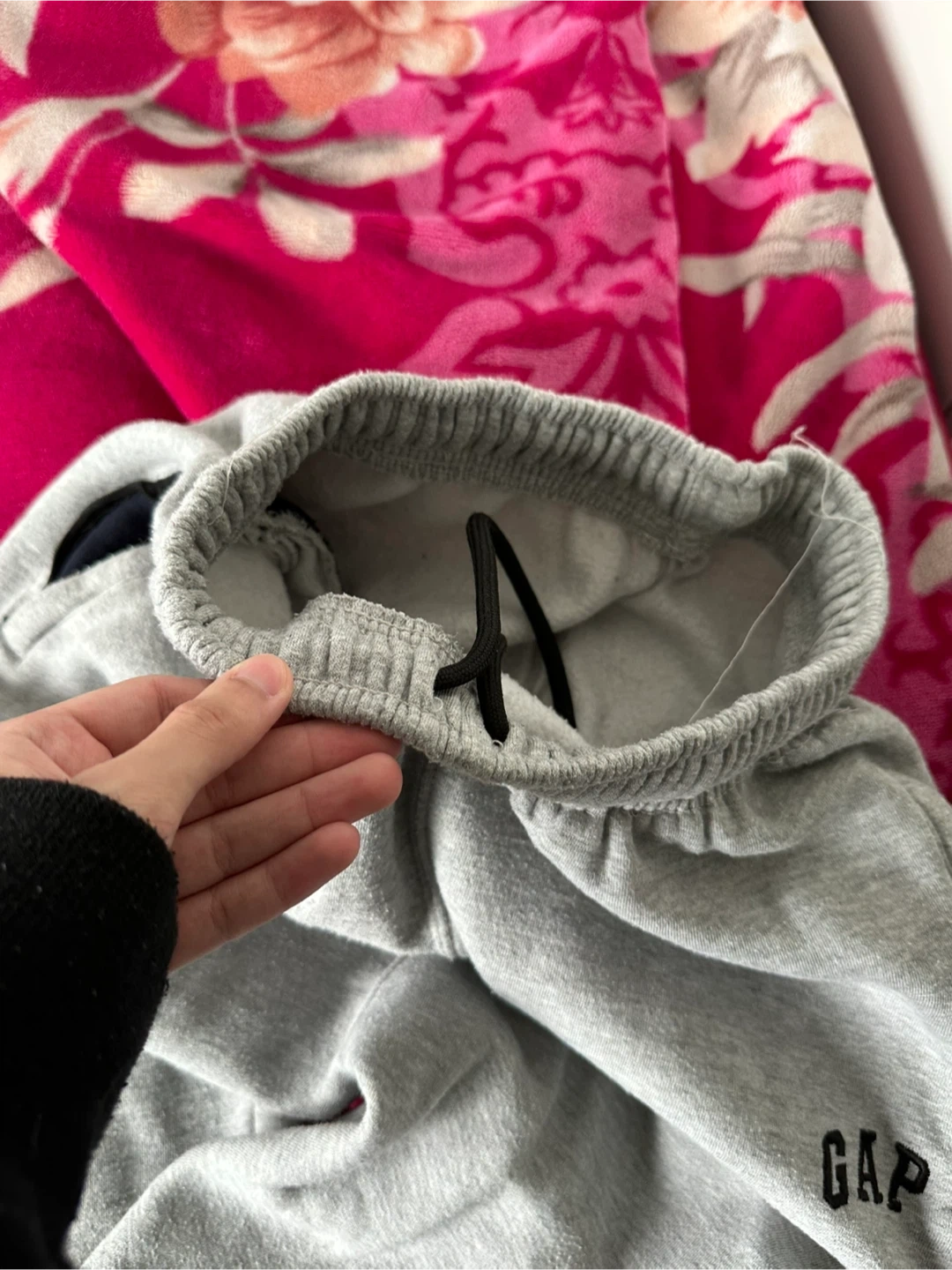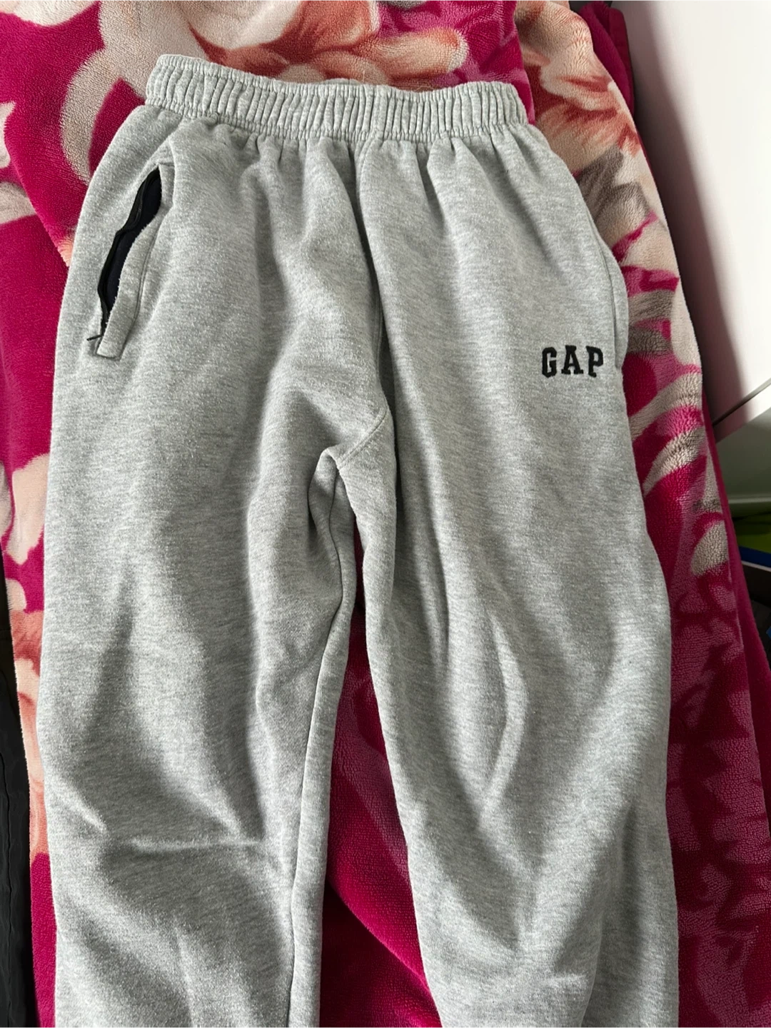 Comfy grey GAP sweatpants. Has elastic waist, zipper pocket, drawstrings inside & a GAP logo on the leg.