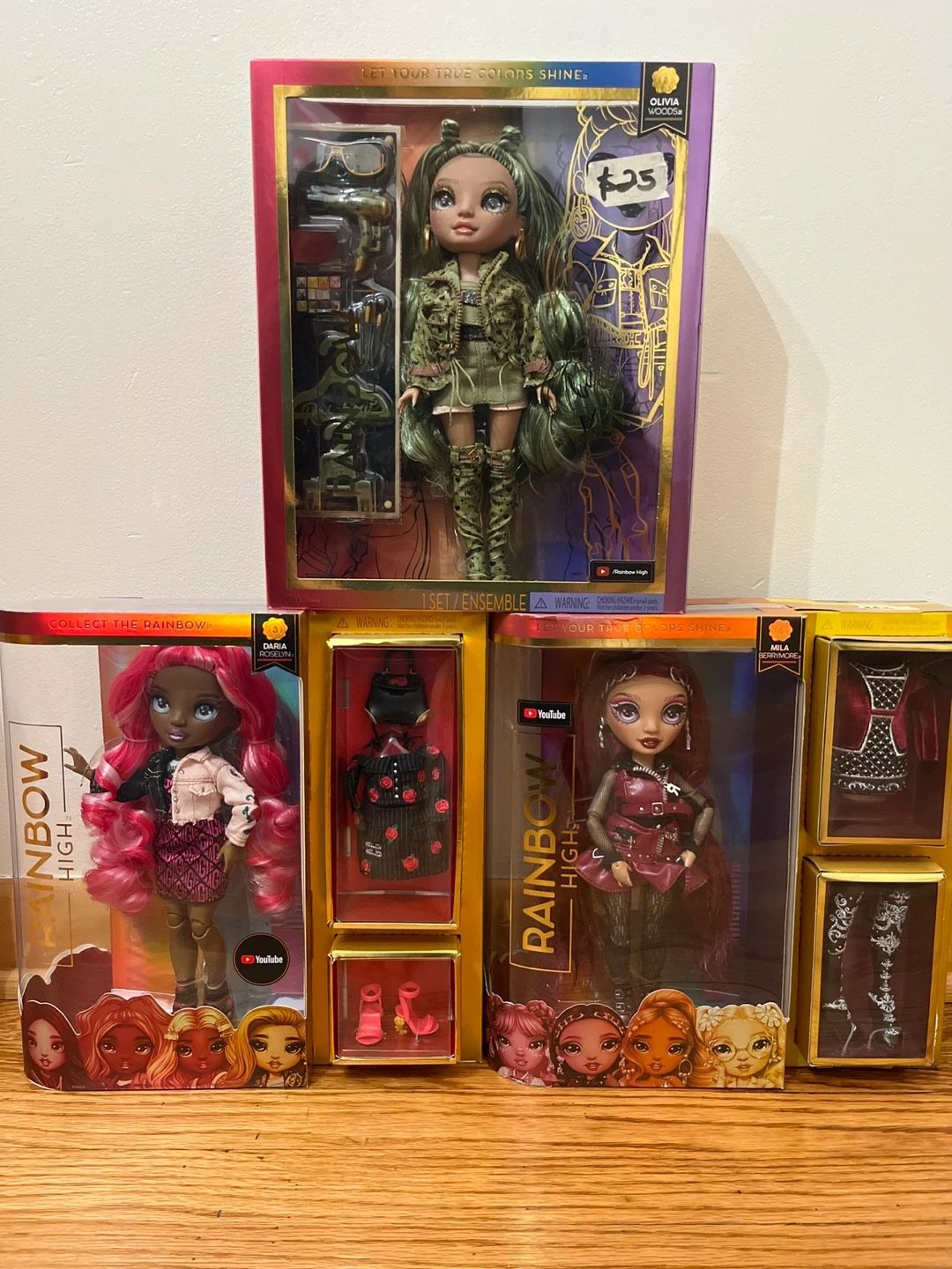 Selling three Rainbow High dolls: Olivia Woods, Daria Roselyn, and Mila Berrymore! Each doll comes with one set/ensemble. They're in great condition and ready for a new home