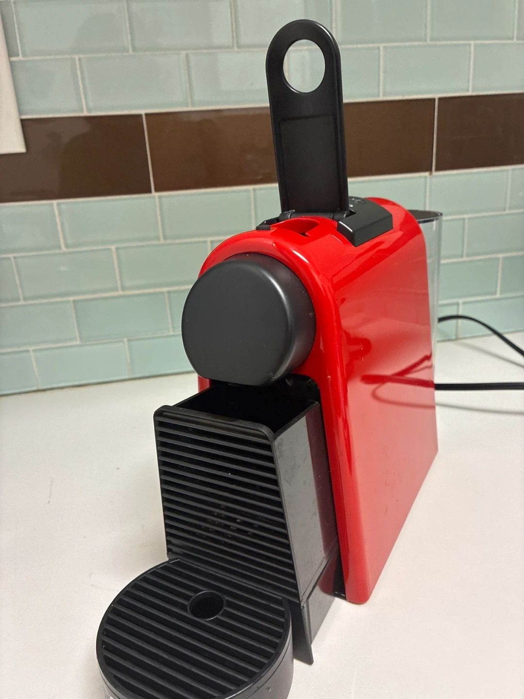 Red DeLonghi Nespresso Essenza Mini espresso machine. It's a compact and simple machine for making espresso. Includes a water reservoir and drip tray. Please check the below website for more information.