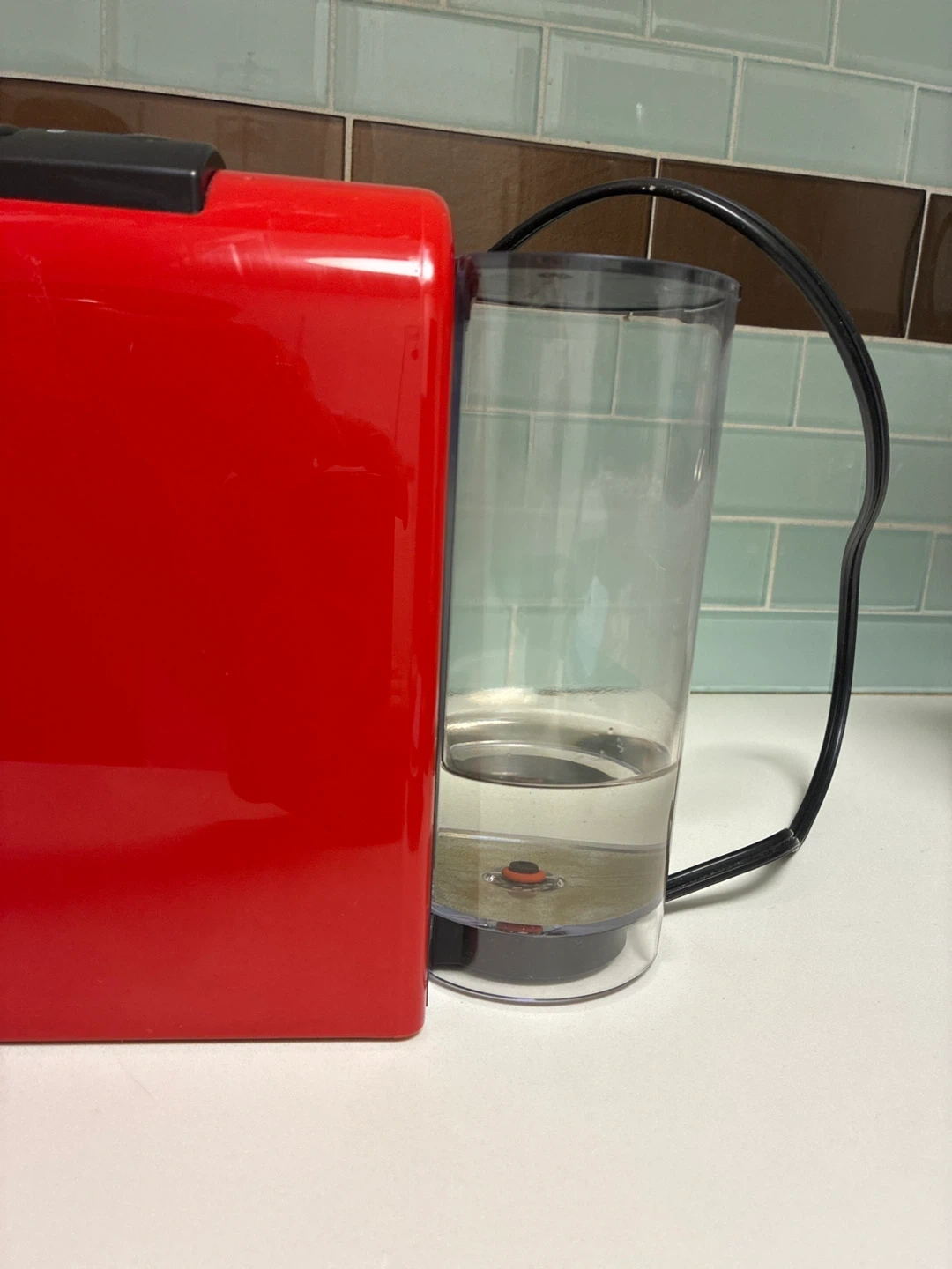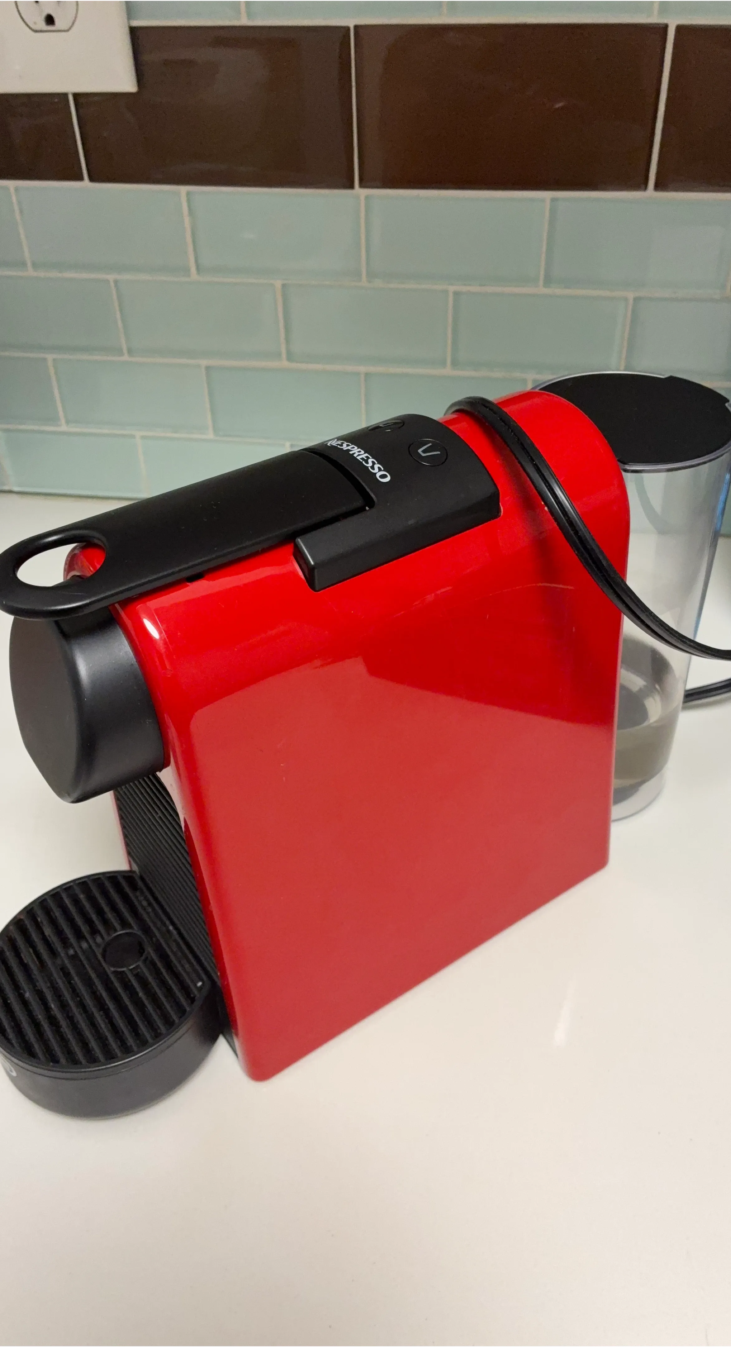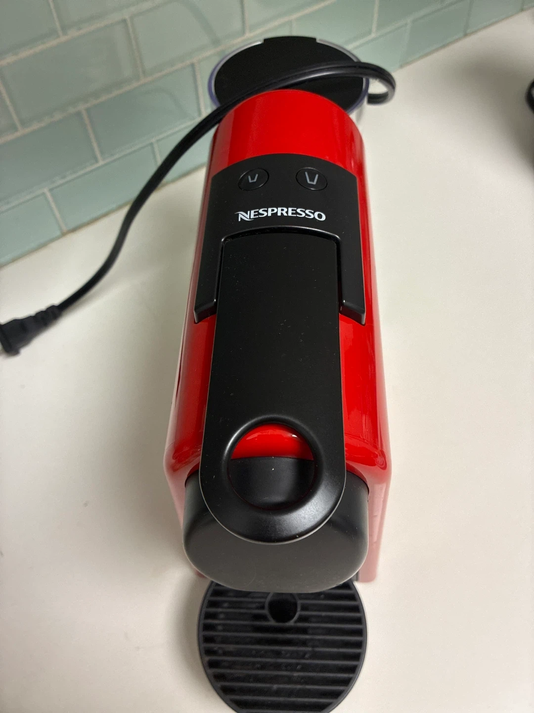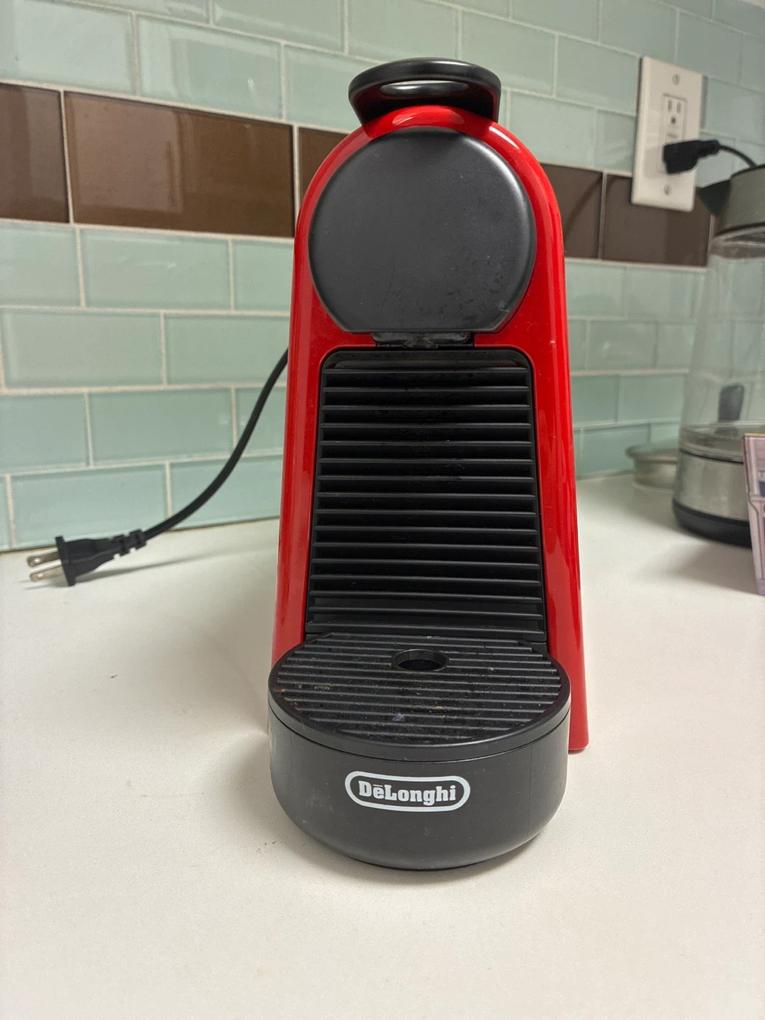 Red DeLonghi Nespresso Essenza Mini espresso machine. It's a compact and simple machine for making espresso. Includes a water reservoir and drip tray. Please check the below website for more information.