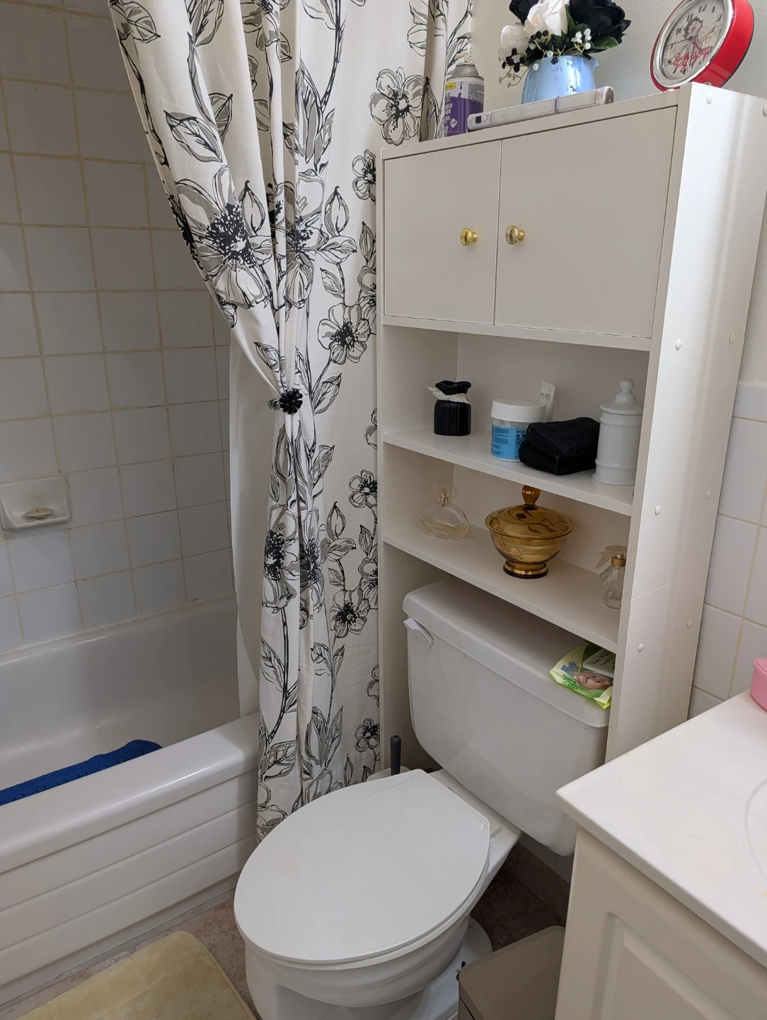 This is a white bathroom storage shelf unit. It's a tall, narrow unit with two cabinets at the top and open shelves below. There's also a small shelf above the toilet tank. It's made of composite wood.