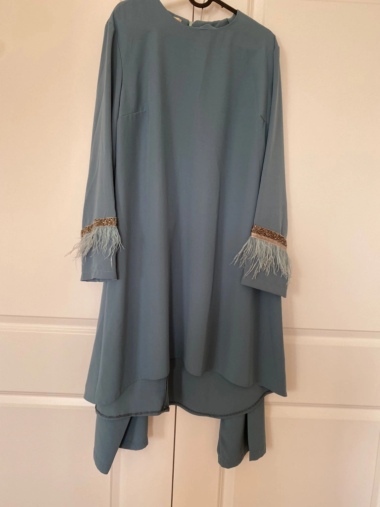 This stunning two-piece outfit would be perfect for a special occasion. The top has long sleeves with embellishments and feathers at the cuffs. The hemline is layered with a unique asymmetrical design. The pants have a matching hemline. You'll surely feel at peace in this beautiful outfit.