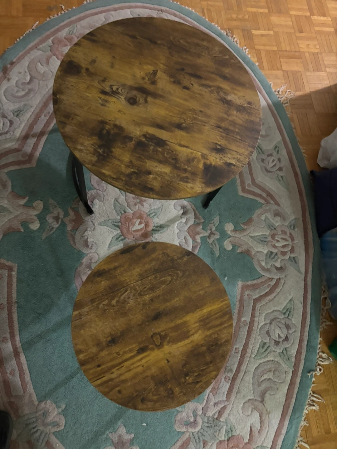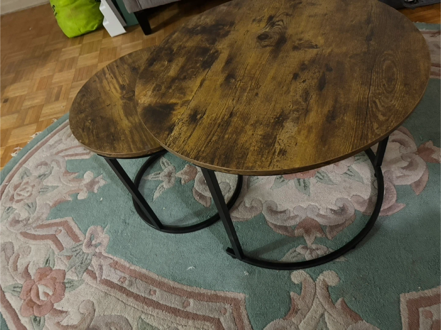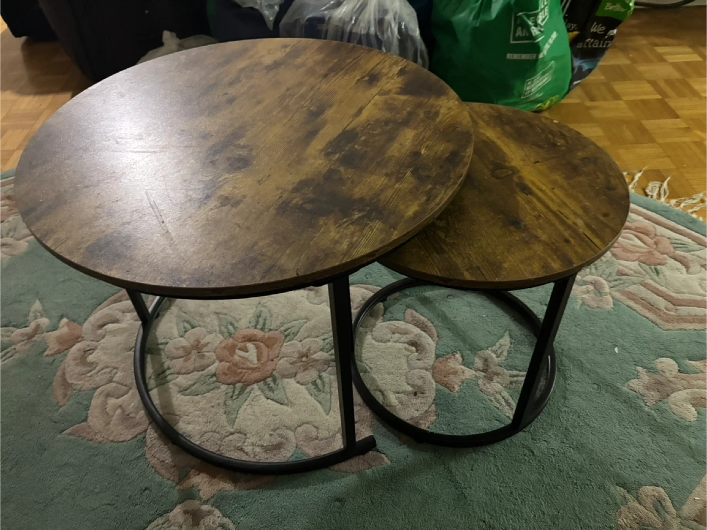 Selling a set of round nesting coffee tables. They have a rustic brown wood-look top and black metal legs. Great for adding a touch of style to your living room or condo!
