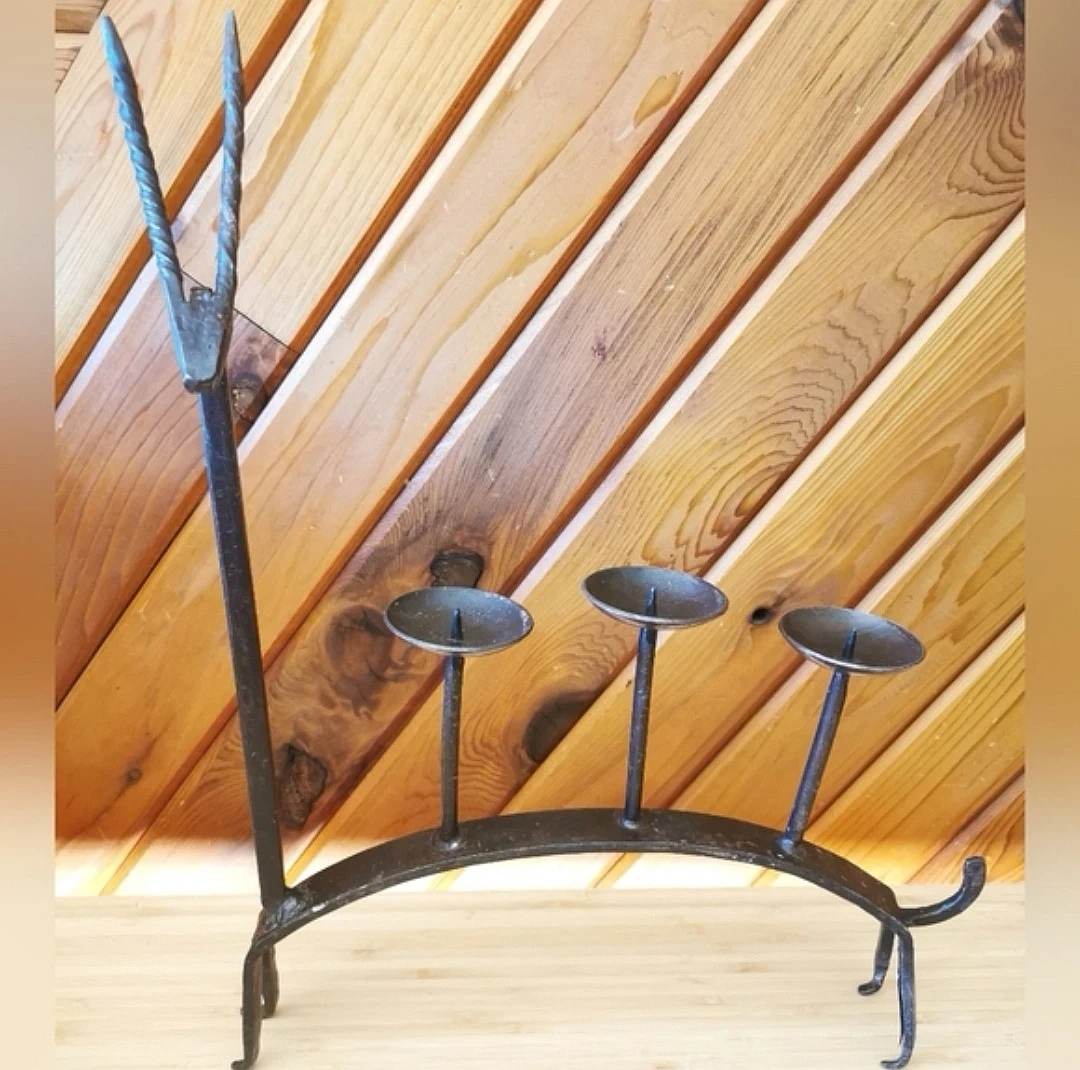 Crafted from heavy blackened iron with visible hammering and organic shaping, this piece embodies classic Brutalist studio metalwork from the mid-century era. The arched back supports three elevated candle cups for candles.