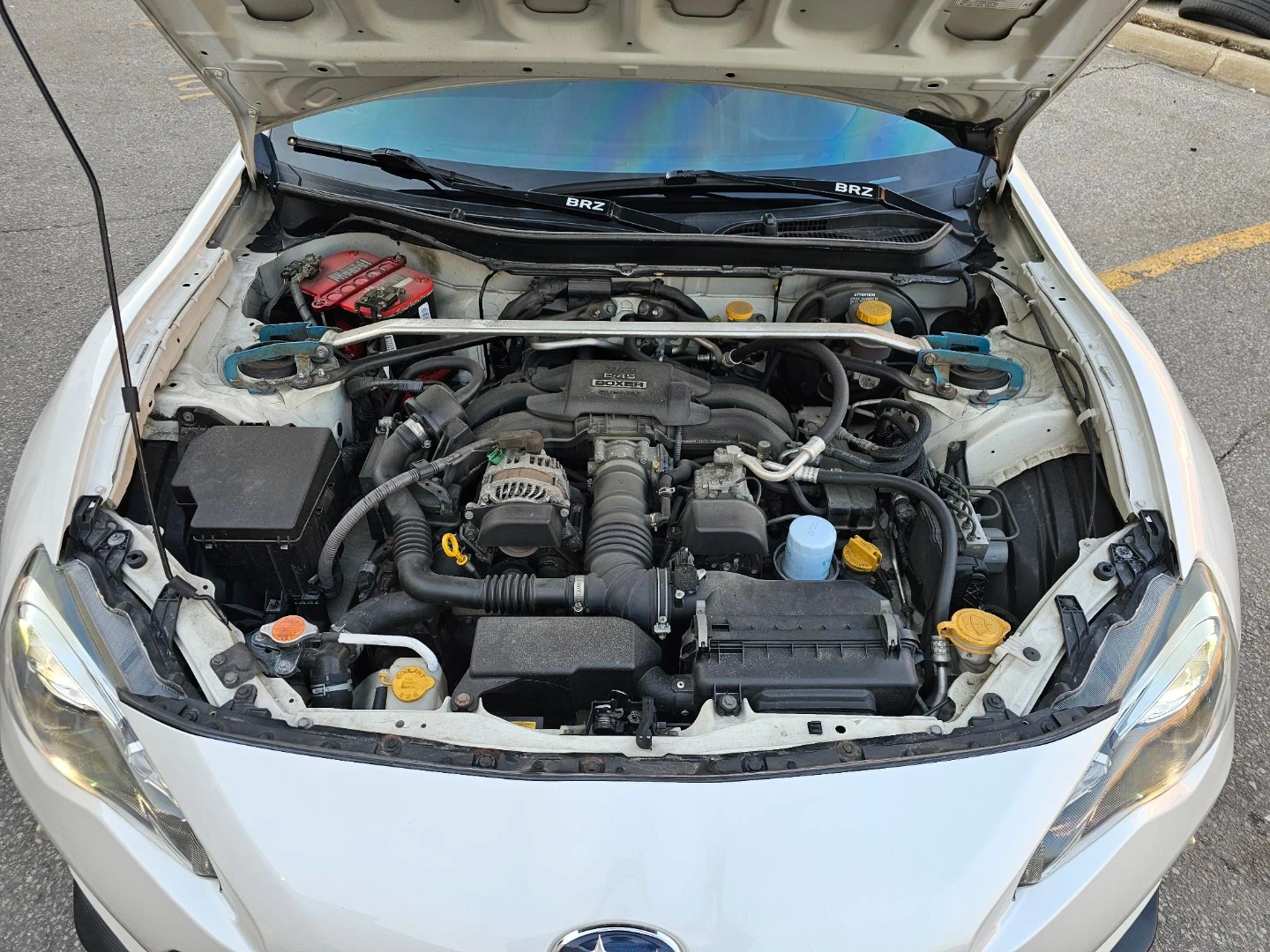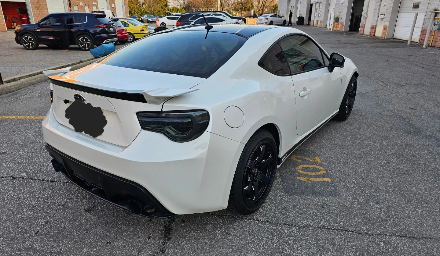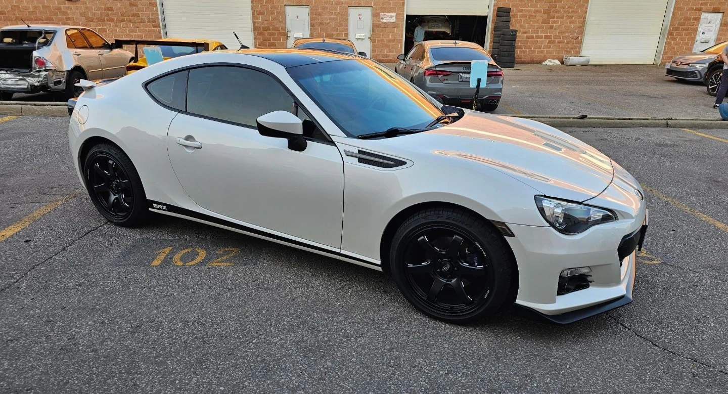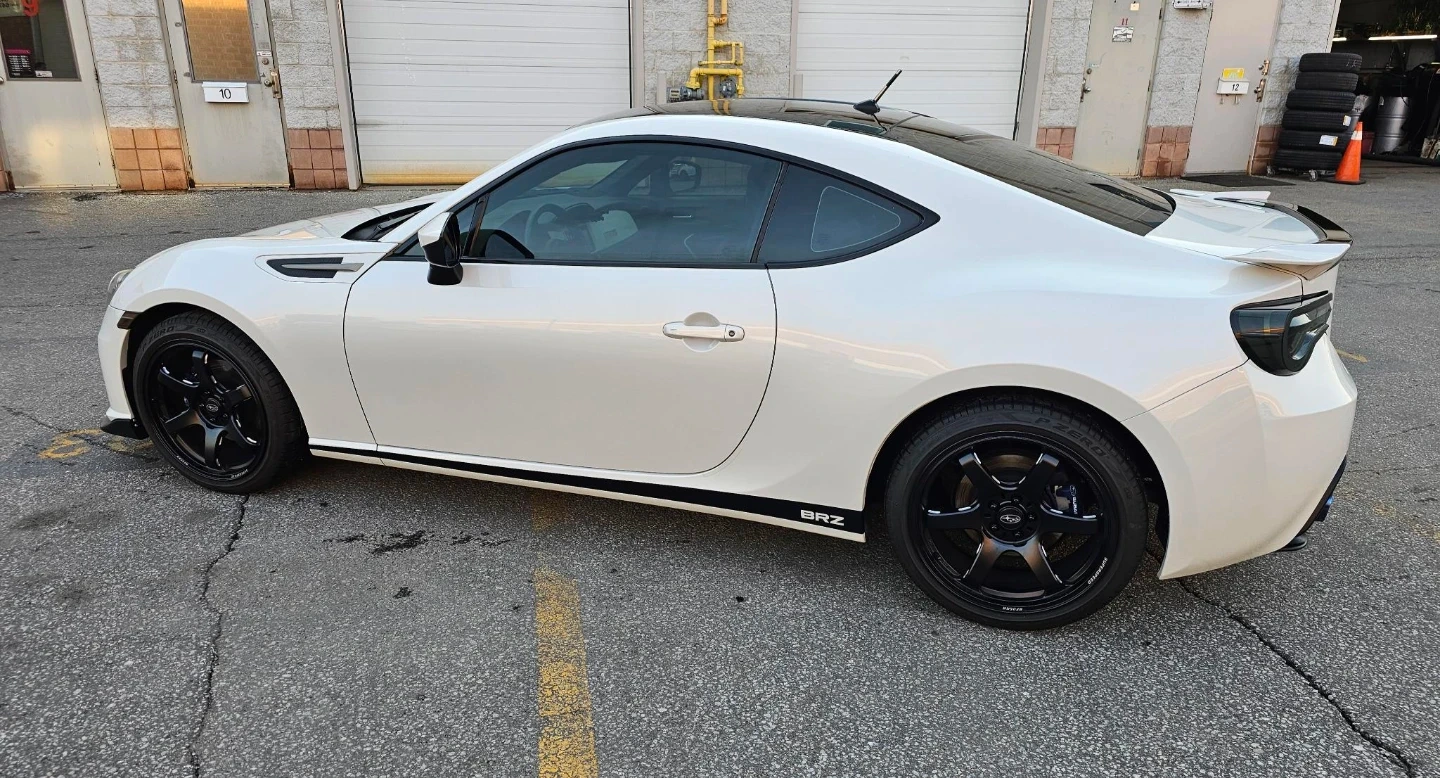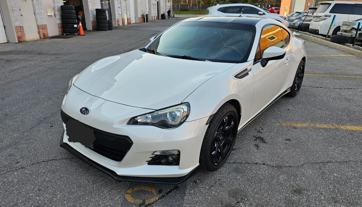 This white Subaru BRZ coupe features a sleek black accent stripe along the side. It's equipped with aftermarket black wheels and a sporty rear spoiler. Comes with tinted windows for added privacy and style.