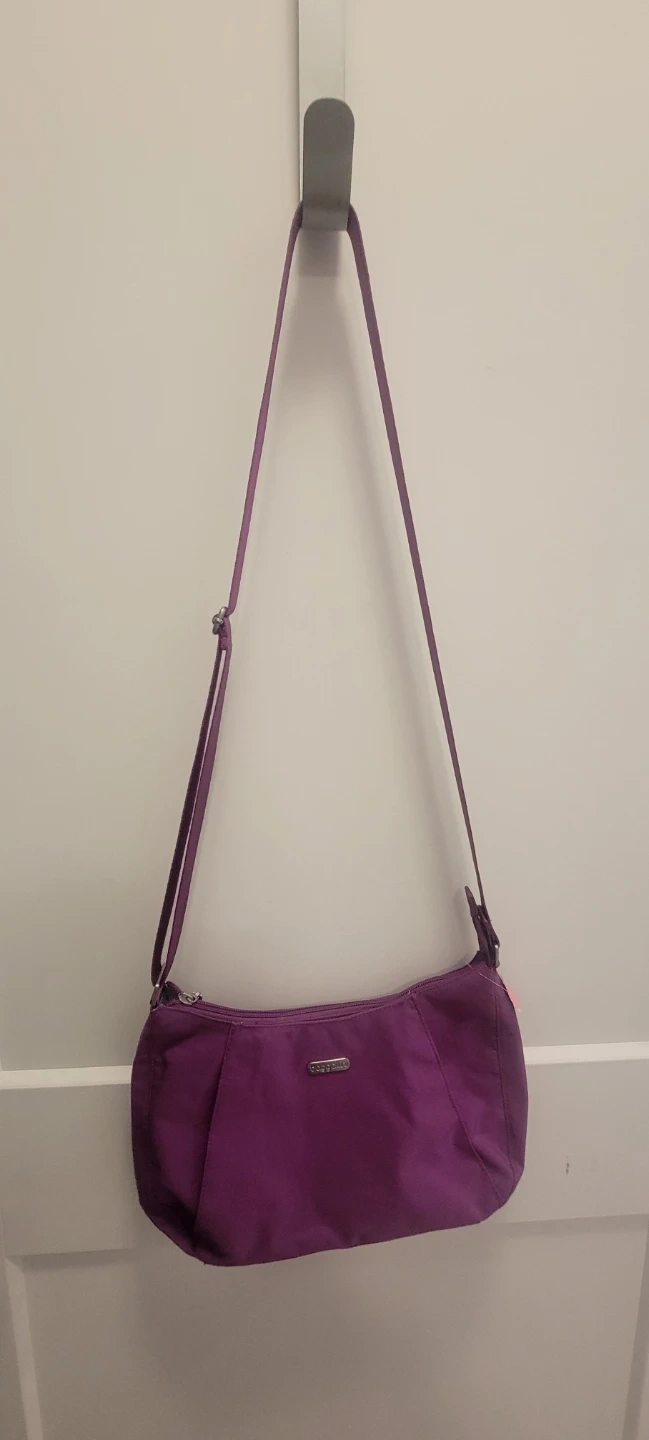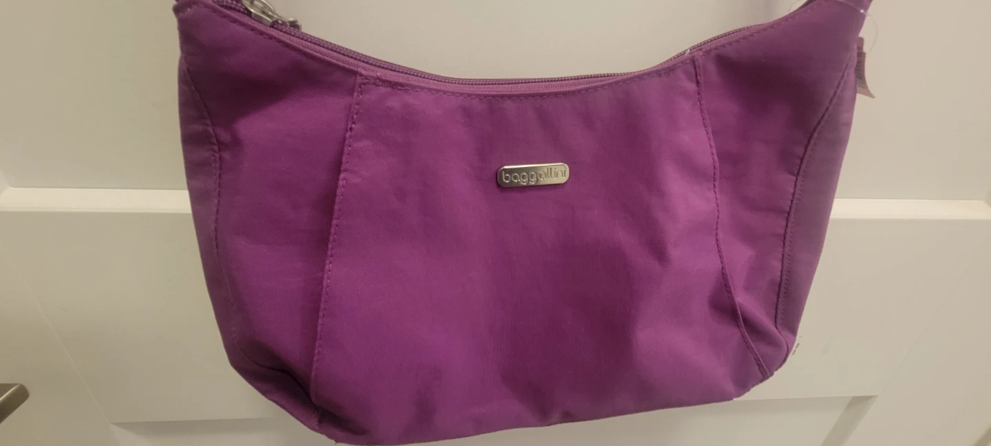 This is a purple Baggallini shoulder bag. It's made of nylon and includes a matching zippered pouch inside. The bag features an adjustable strap and multiple interior pockets.