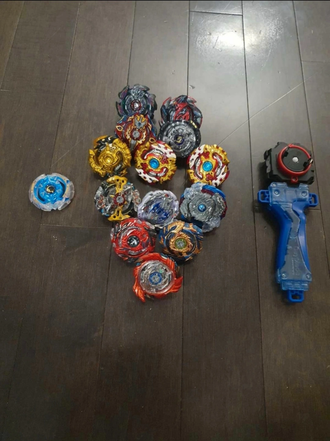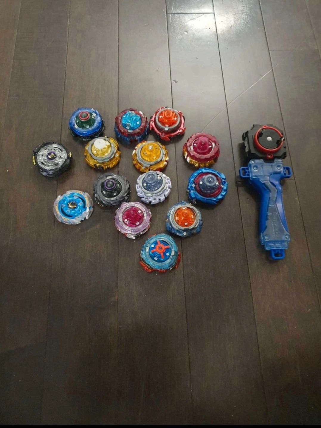 Collection of Beyblades. Includes a launcher and carrying case. Great for collectors or players. Various colours and designs.