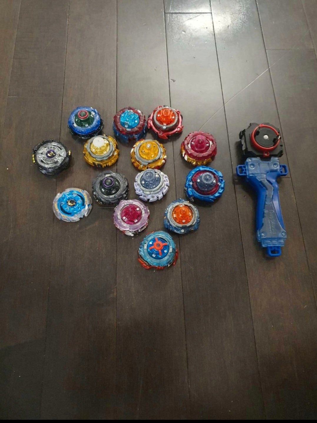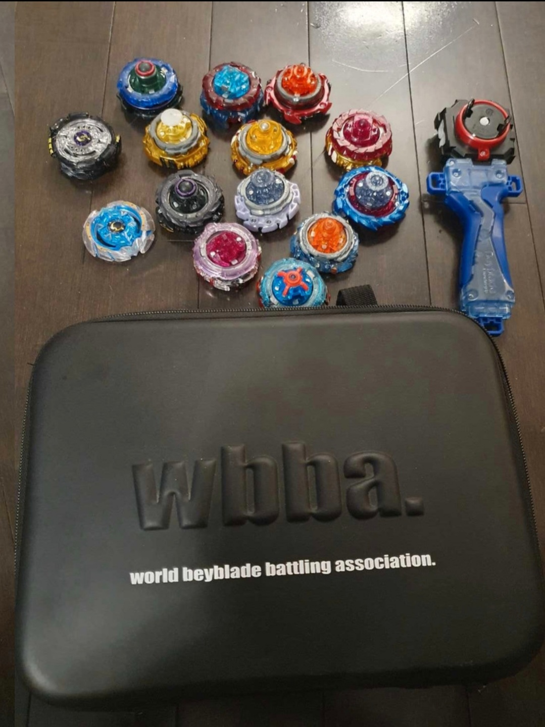Collection of Beyblades. Includes a launcher and carrying case. Great for collectors or players. Various colours and designs.