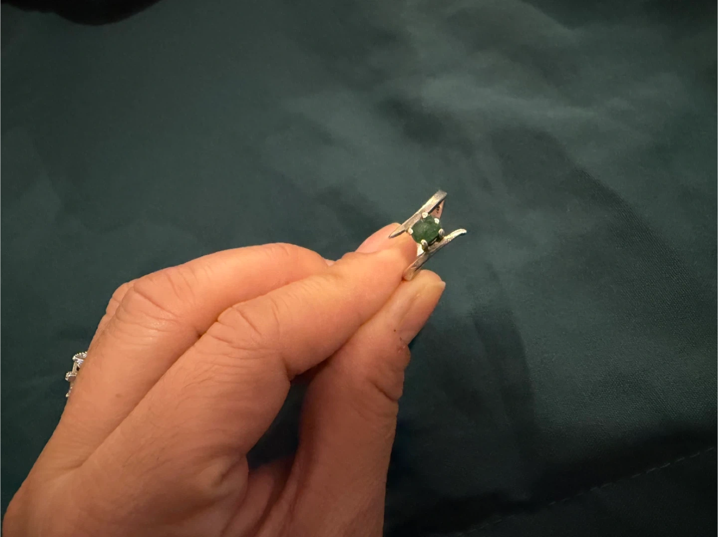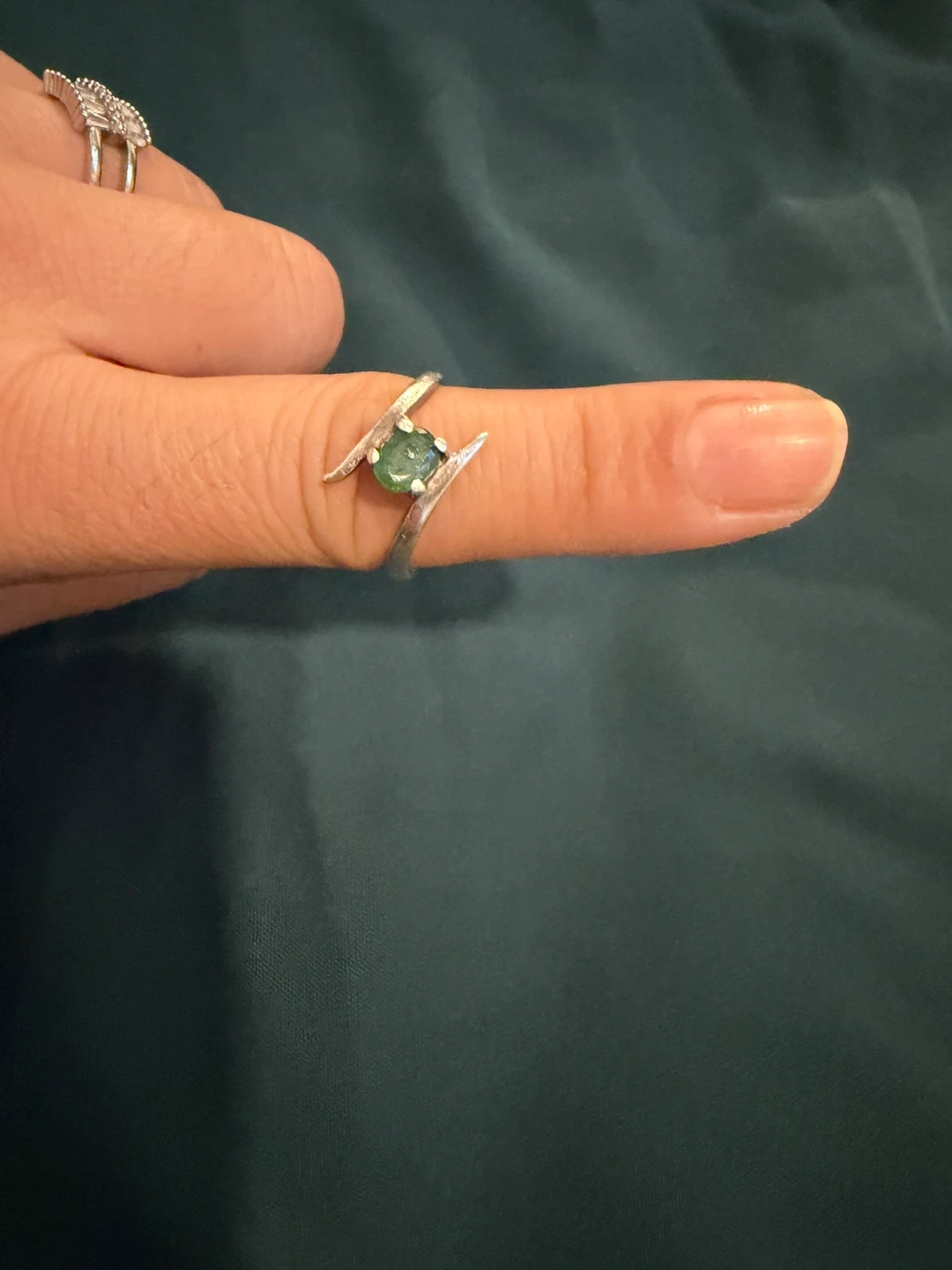 A lovely vintage Sterling Silver ring featuring a green genuine emerald stone, perfect for adding a touch of colour to your outfit! It's in great condition and ready for a new owner.