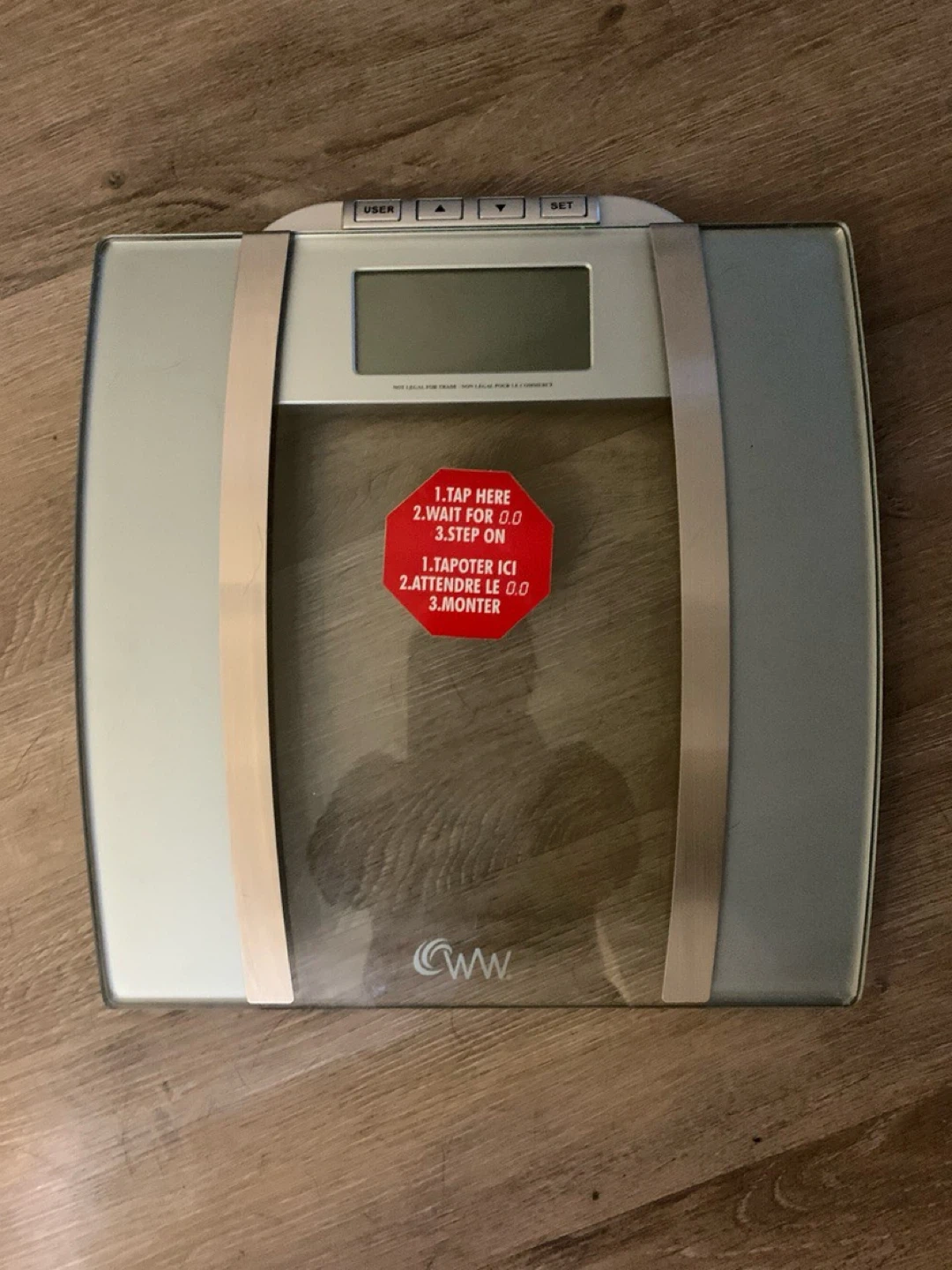 This is a WW digital bathroom scale. It has a glass platform and an LCD display. It's a great tool for tracking your weight. Can register and save data for several persons.